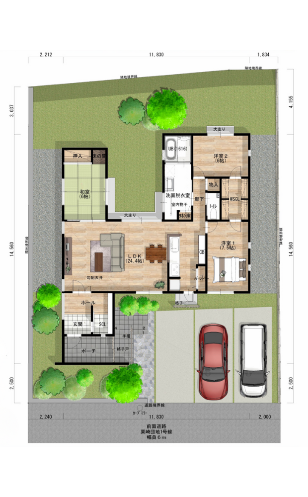 コの字型をアレンジした間取りで、中庭(11.7畳)を囲むように建物を配置しています。間口約14.5mの敷地に対応し、変形していない整形地でも実現できる設計です。