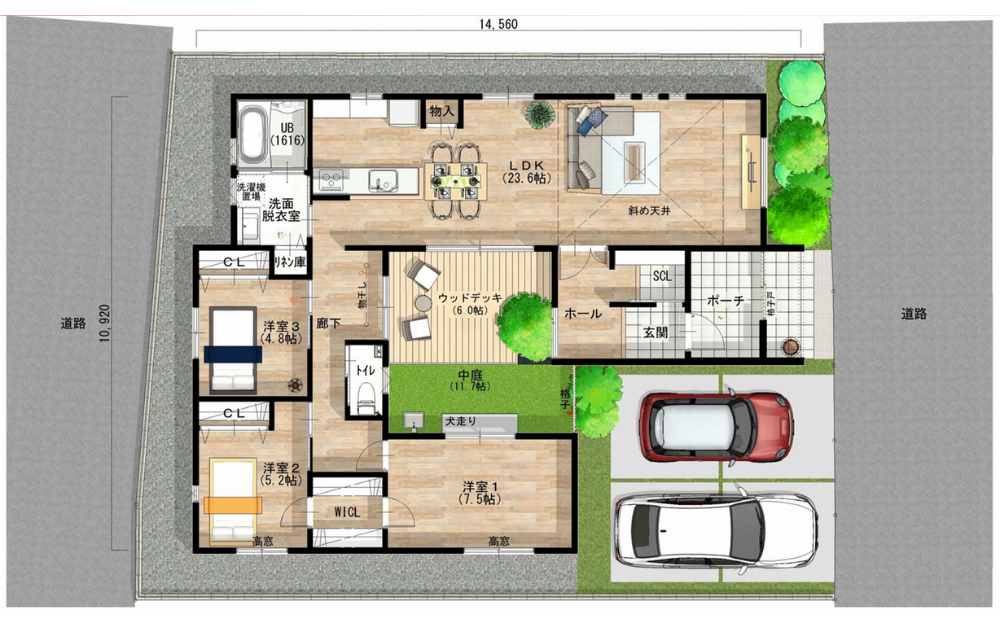 23.6畳のLDKには勾配天井を採用し、視線が上に抜けることで広がりを感じられます。ウッドデッキ(6.0畳)が中庭とリビングをつなぎ、室内外の一体感を高めています。