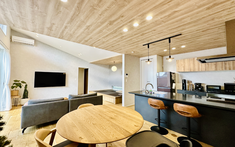 24.4帖のLDKには勾配天井を採用し、視線が上に抜けることで開放感を演出しています。天井の高低差が空間に変化を生み、実面積以上の広がりを感じられます。キッチンは対面式で、リビング・ダイニング全体を見渡せる配置です。
