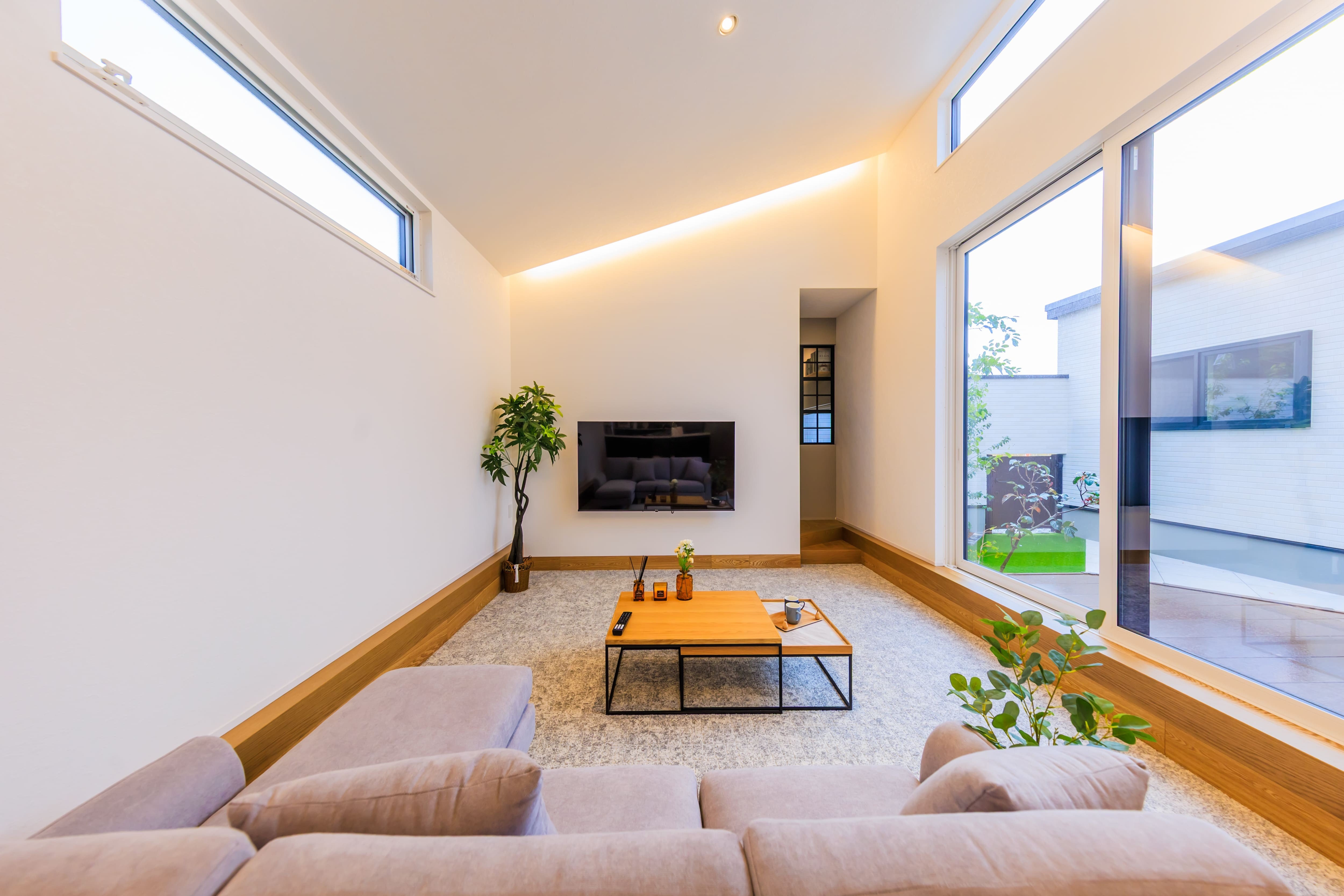 特にプラスリッコが得意とする中庭を持つ平屋では、勾配天井との相性が抜群です。中庭に面したリビングに勾配天井を採用することで、水平方向(中庭への広がり)と垂直方向(天井の高さ)の両方で開放感を得られ、より豊かな空間体験が生まれます。