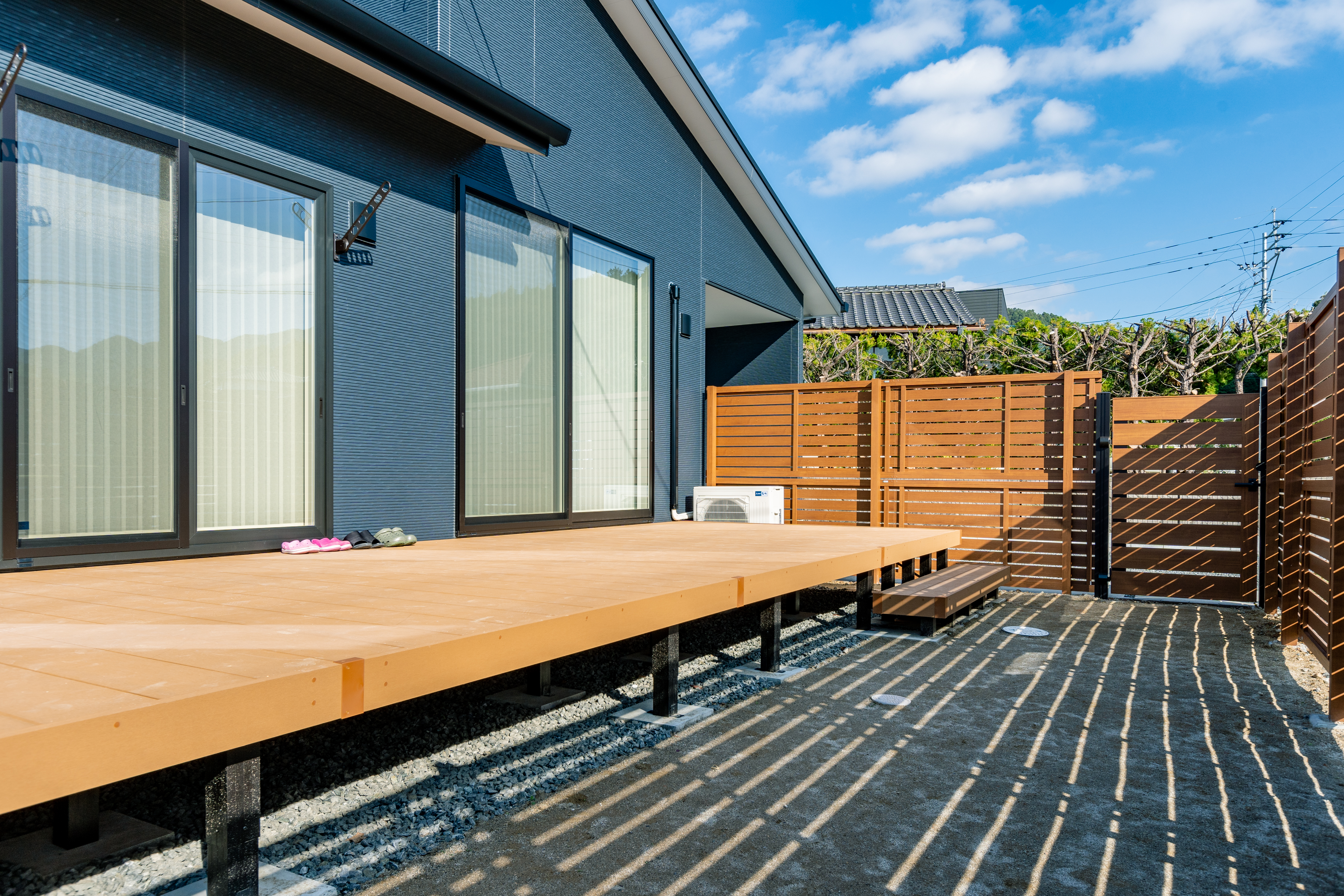 事例②:ネイビーの外観と13.5帖のウッドデッキが印象的な平屋