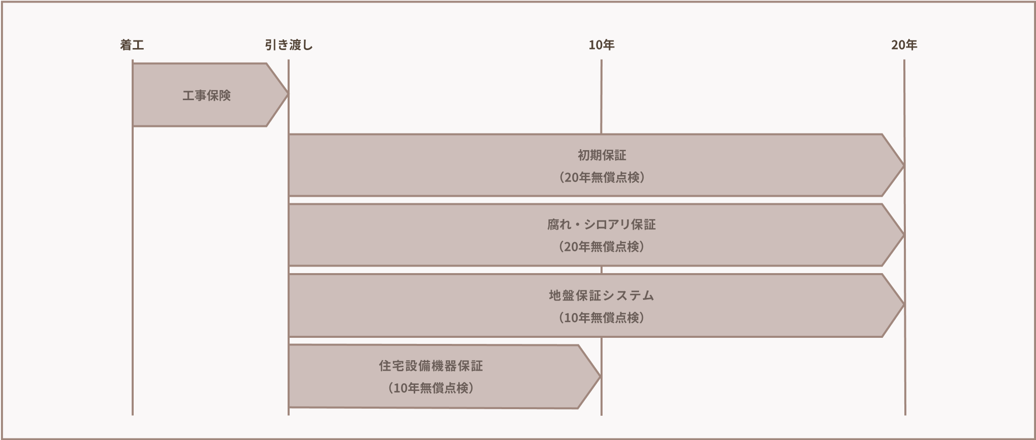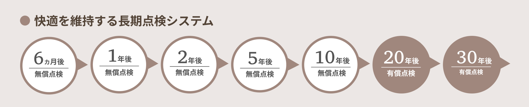 各種保証についてお客様との関係は、お引き渡しをもって終わりではありません。お引き渡し後も、地盤保証システムや住宅設備機器の10年間無償点検に加え、初期保証、腐朽、シロアリ対策についてはそれぞれ20年の長期保証をご提供しています。お客様が長く安心して暮らせるよう、きめ細やかなアフターサポート体制を整え、継続的にお住まいを見守ってまいります。