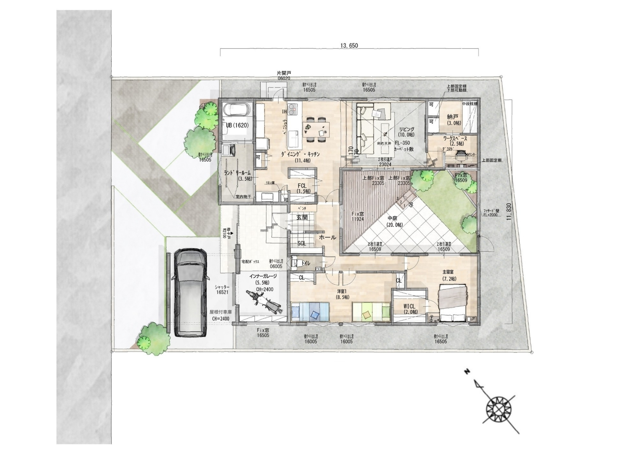 中庭のウッドデッキと人工芝が、住まいにやさしい光と開放感を届けます。サンクンリビングと勾配天井のあるリビングは、中庭に面した大開口から季節ごとの光を楽しめる空間。ワークスペースやインナーガレージ、回遊動線、豊富な収納など、暮らしやすさも充実。