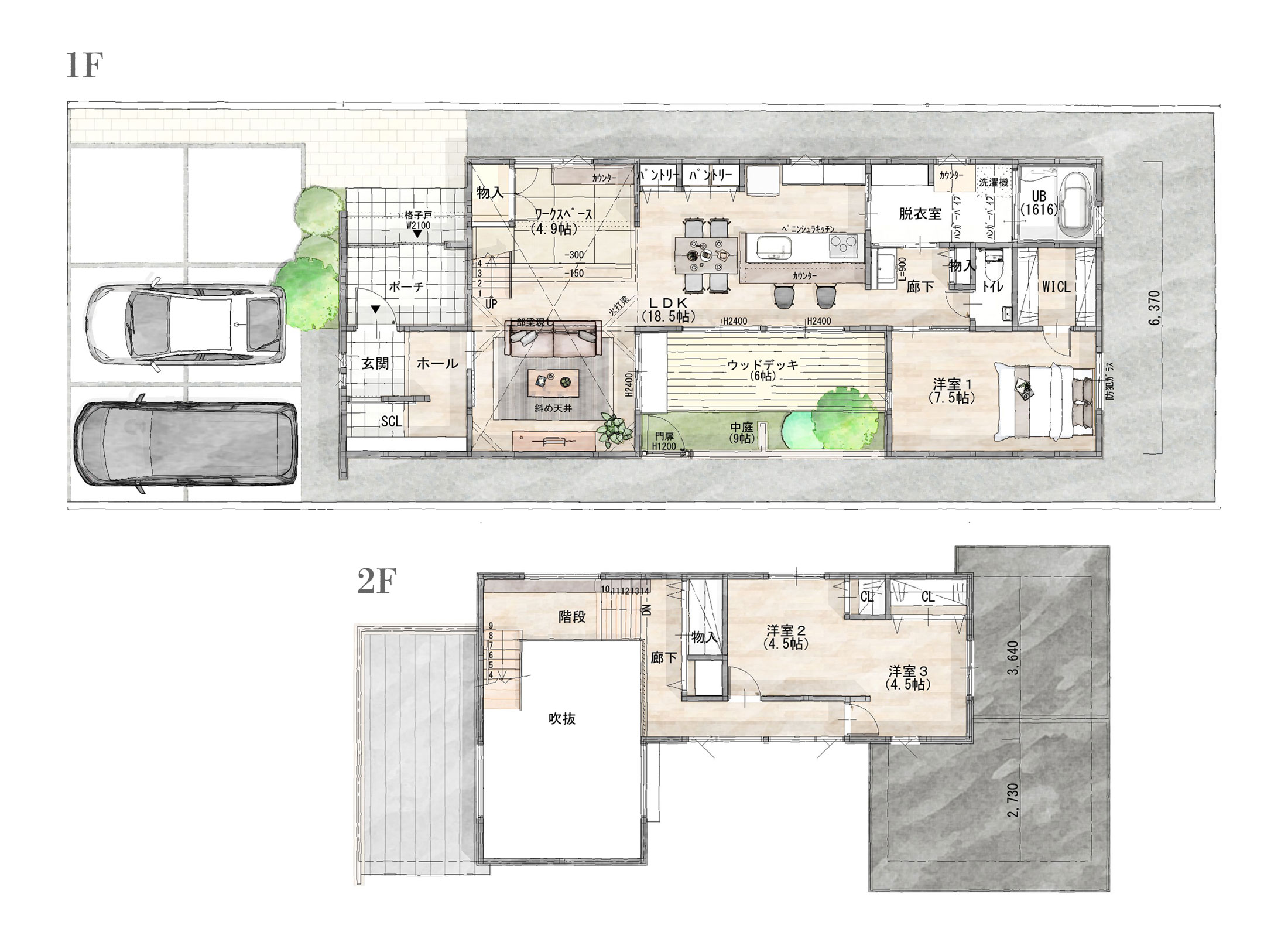 1階に水まわりと主寝室を集約し、中庭でプライバシーと開放感を両立。吹き抜けリビングとシースルー階段が大空間を演出します。将来間仕切れる2階洋室や、家事がはかどる動線も魅力。