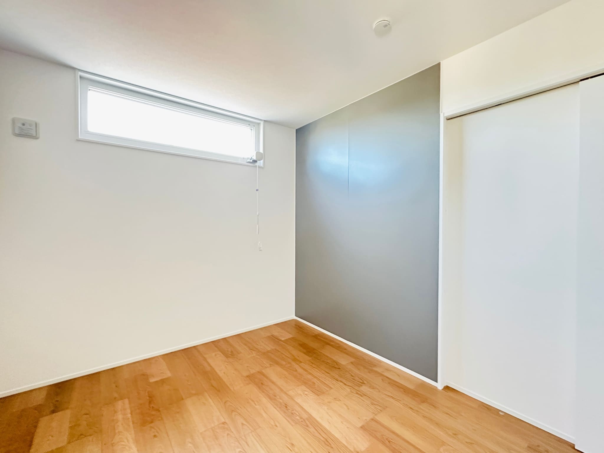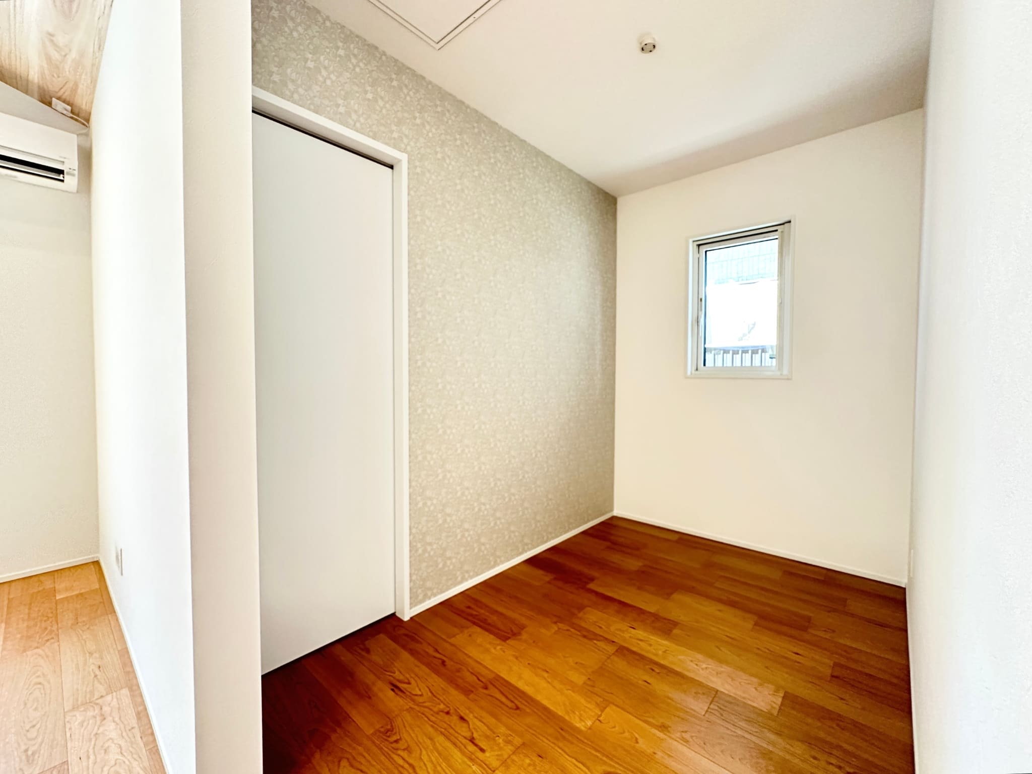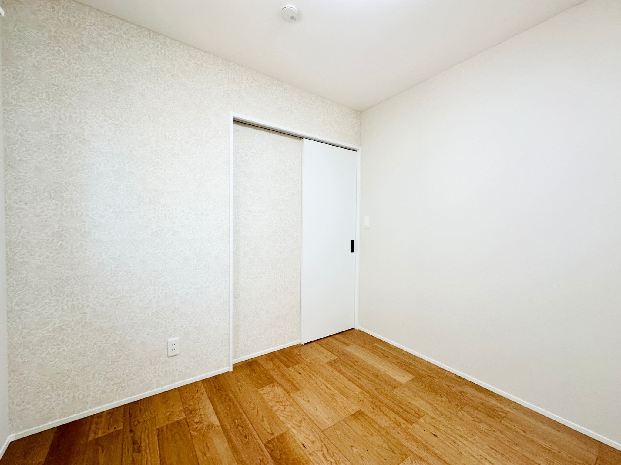 4.5帖の洋室。ドア側に取り入れた自然モチーフのアクセントクロスは、控えめながらもお施主様のセンスを感じる仕上がりです。