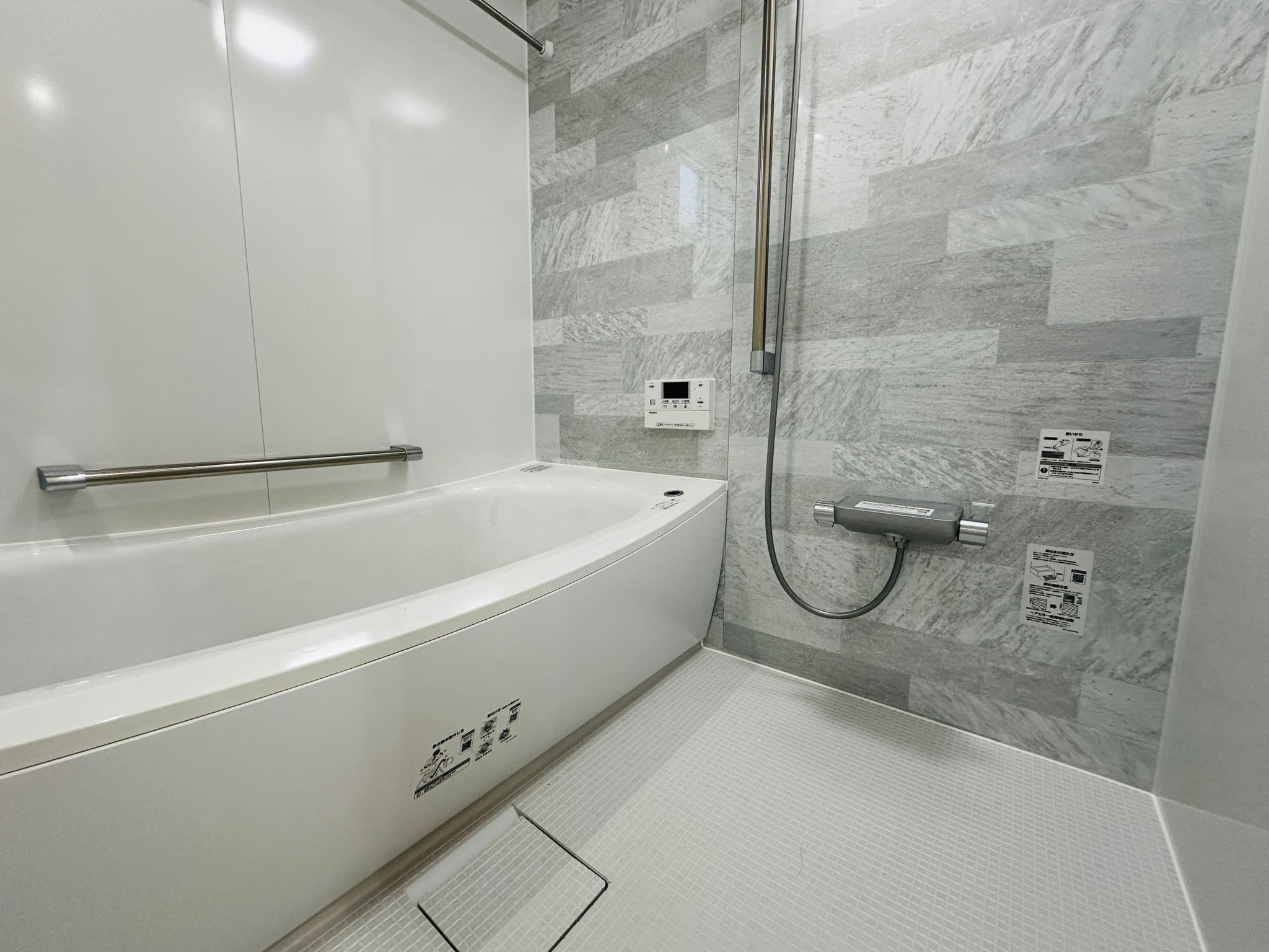 浴室には、ホワイトの石目柄「パティオホワイト」をアクセントに採用。光を受けてやわらかく陰影が生まれる石目柄が、空間に上品な表情を添え、清潔感あふれる明るいバスルームに仕上げています。