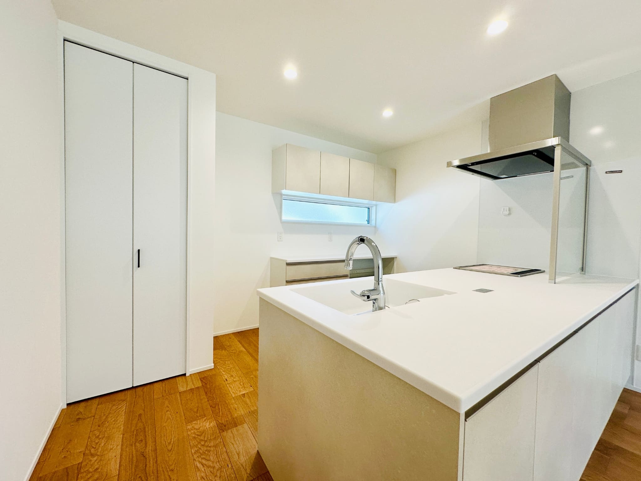 白で統一された明るいキッチン。パントリー付きで、食材や道具もすっきり収納できます。毎日の家事が快適に進む空間です。