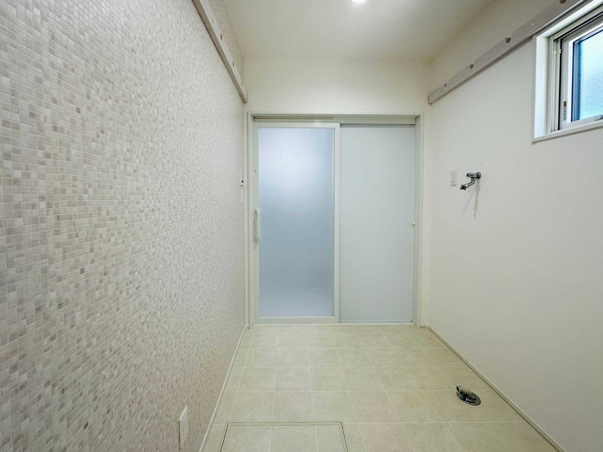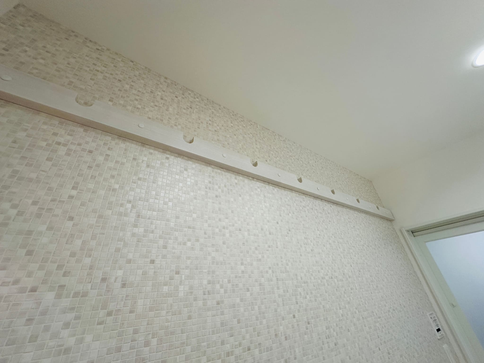 ランドリールームには、パールの光沢が美しいモザイクタイル調のアクセントクロスを採用。色や光沢で明るさや華やかさを演出でき、単調になりがちな水回りもおしゃれに仕上がります。