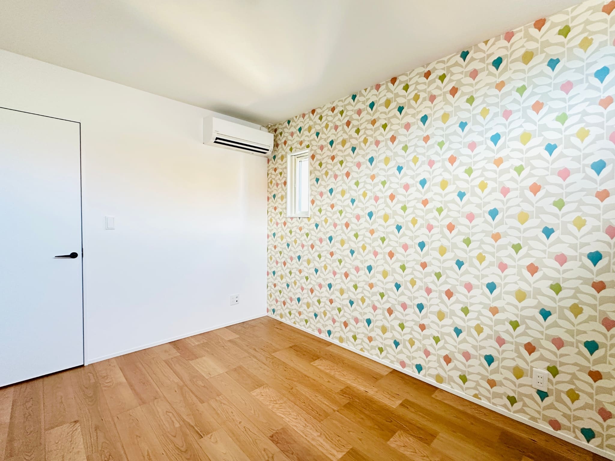 主寝室には、色とりどりの花々がポップでかわいらしいキャッチーなフラワー柄のアクセントクロスを採用。壁一面に華やかなデザインが広がり、寝室に入った瞬間から明るく楽しい気分を感じられる空間に仕上げています。