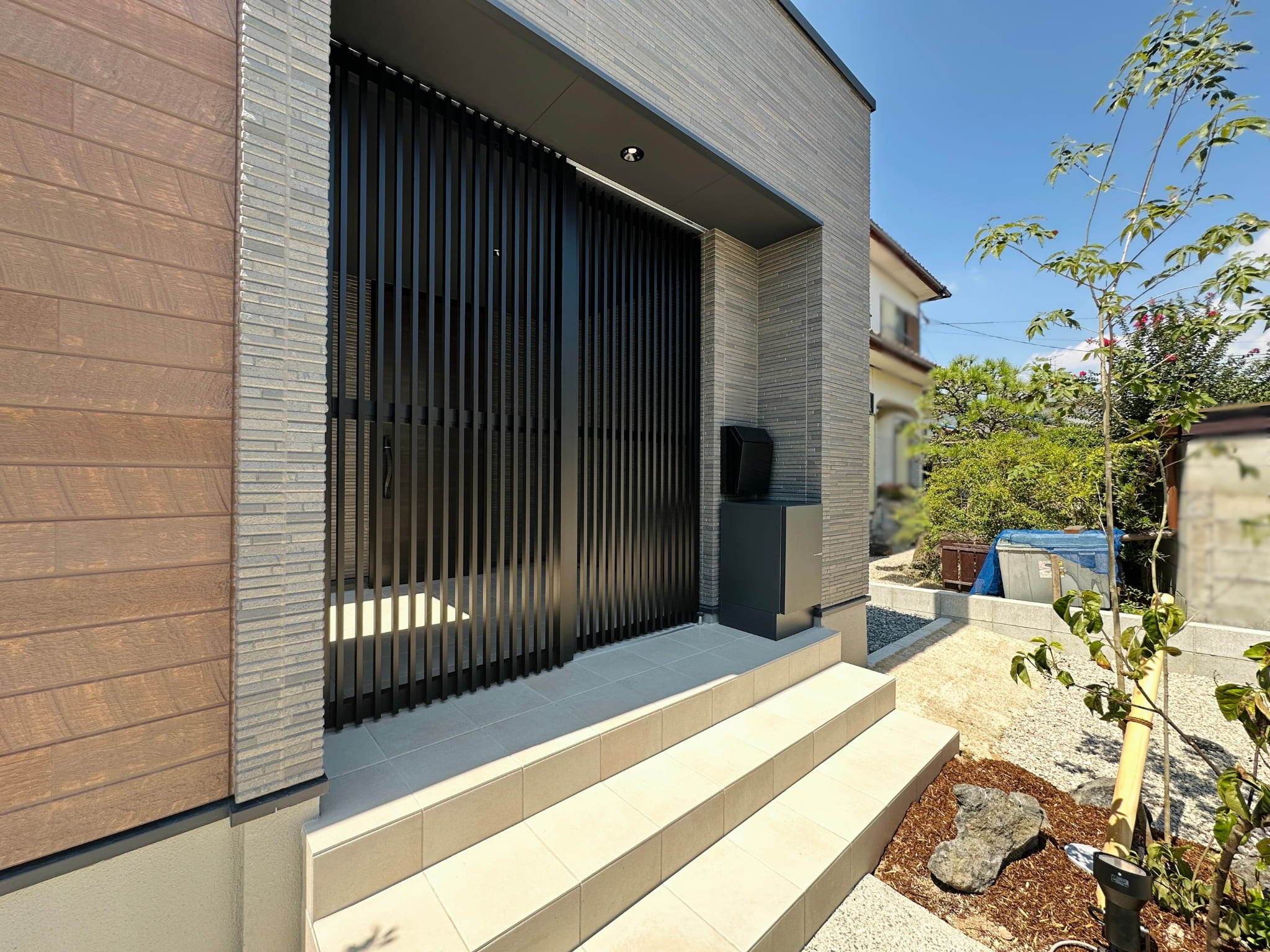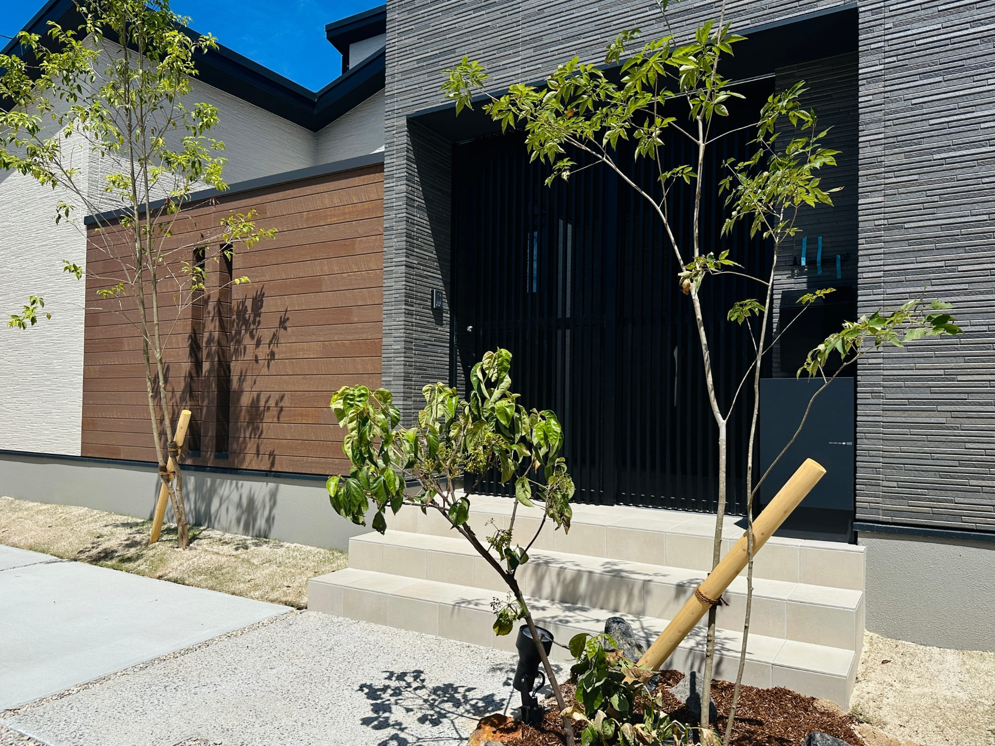 木目調のアクセントと落ち着いたグレーの外壁が調和した、スタイリッシュな外観。植栽の緑がやさしく住まいを引き立て、四季を通じて表情豊かな玄関まわりを演出します。