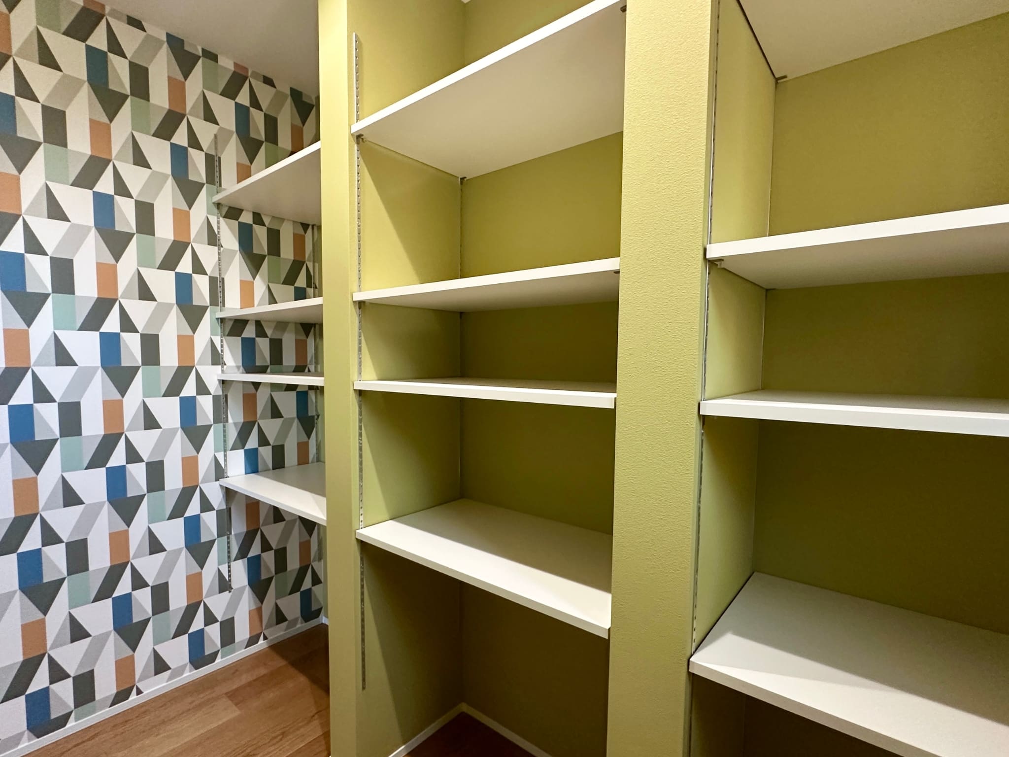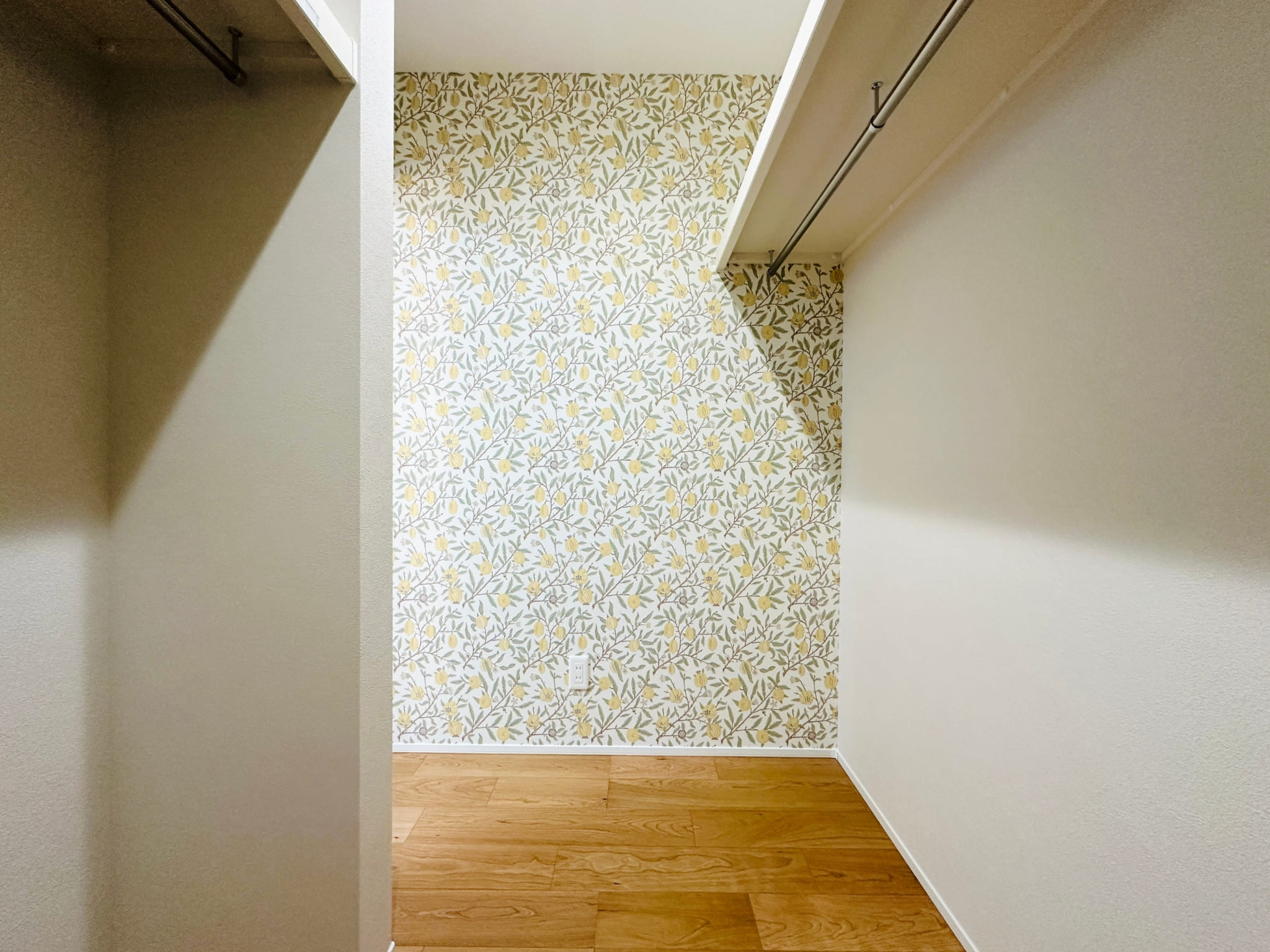 約3.1帖のウォークインクローゼット。ベースのクロスはマットな質感とくすんだカラーでモダンな印象を演出し、アクセントクロスにはリズミカルに三角形や四角形が連なるインパクトのある幾何学パターンを採用。収納空間ながら、個性をプラスしています。