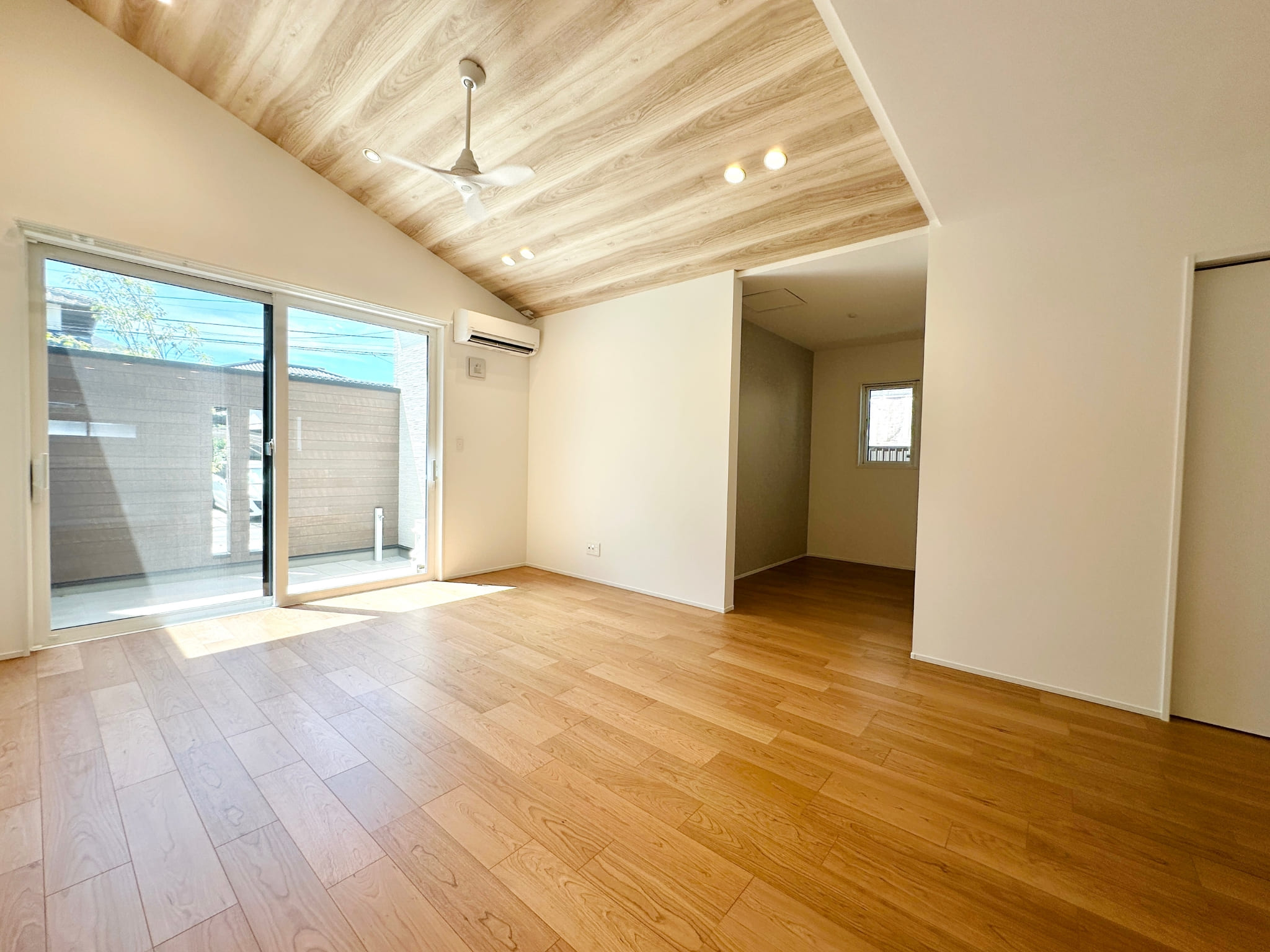 大きな窓から光があふれる約19.6帖のリビング。勾配天井の木目調のクロスが自然のぬくもりを感じさせます。明るく開放的でありながら、落ち着きのあるリビング空間です。