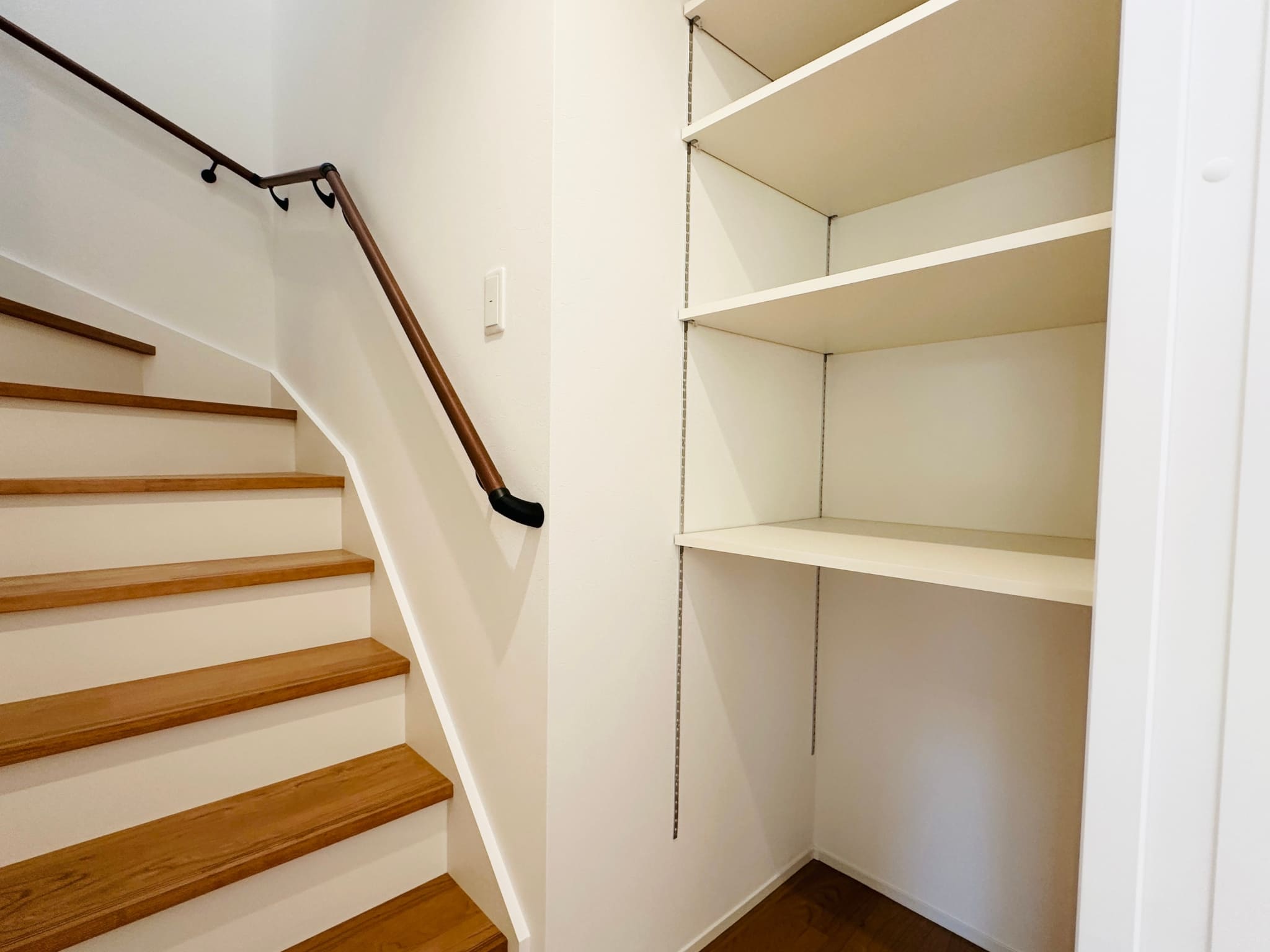 二階へ上がる廊下には物入を設置。トイレ周りの小物や日常使いの収納に便利で、廊下まわりをすっきり保てます。