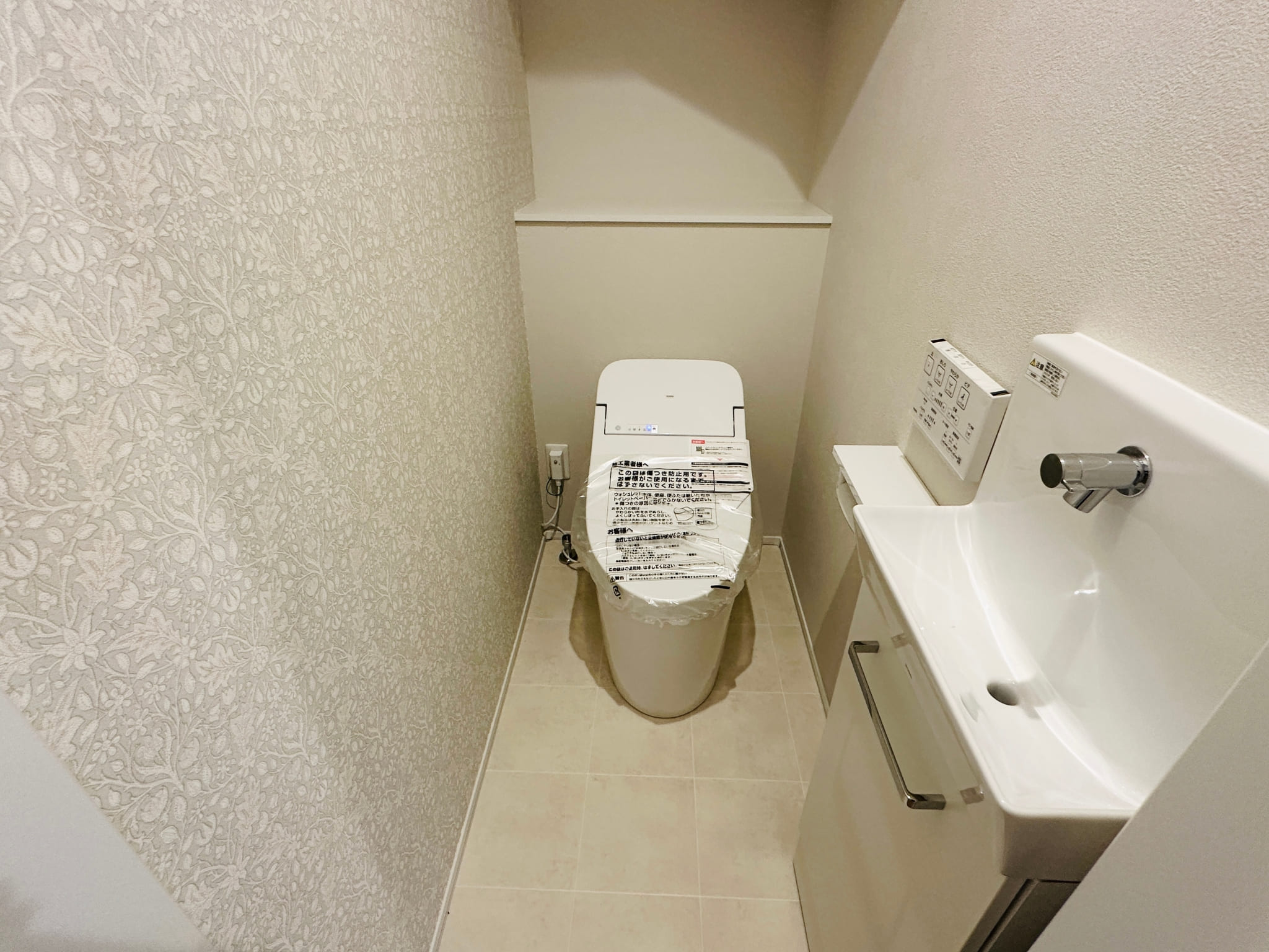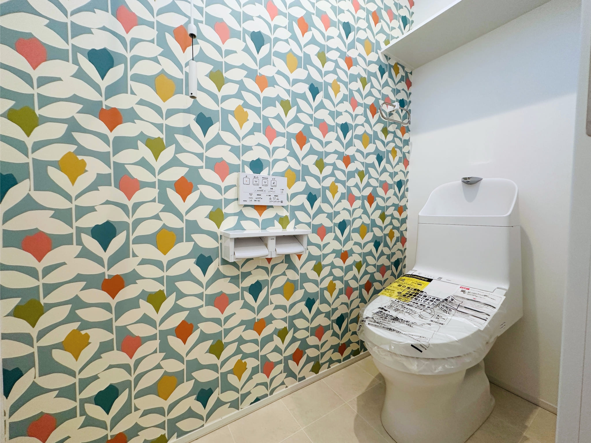 2階のお手洗いは、色とりどりの花々がポップに散りばめられたフラワー柄を採用。明るくかわいらしい雰囲気で、1階のお手洗いとはまた違った楽しさが広がる空間になっています。