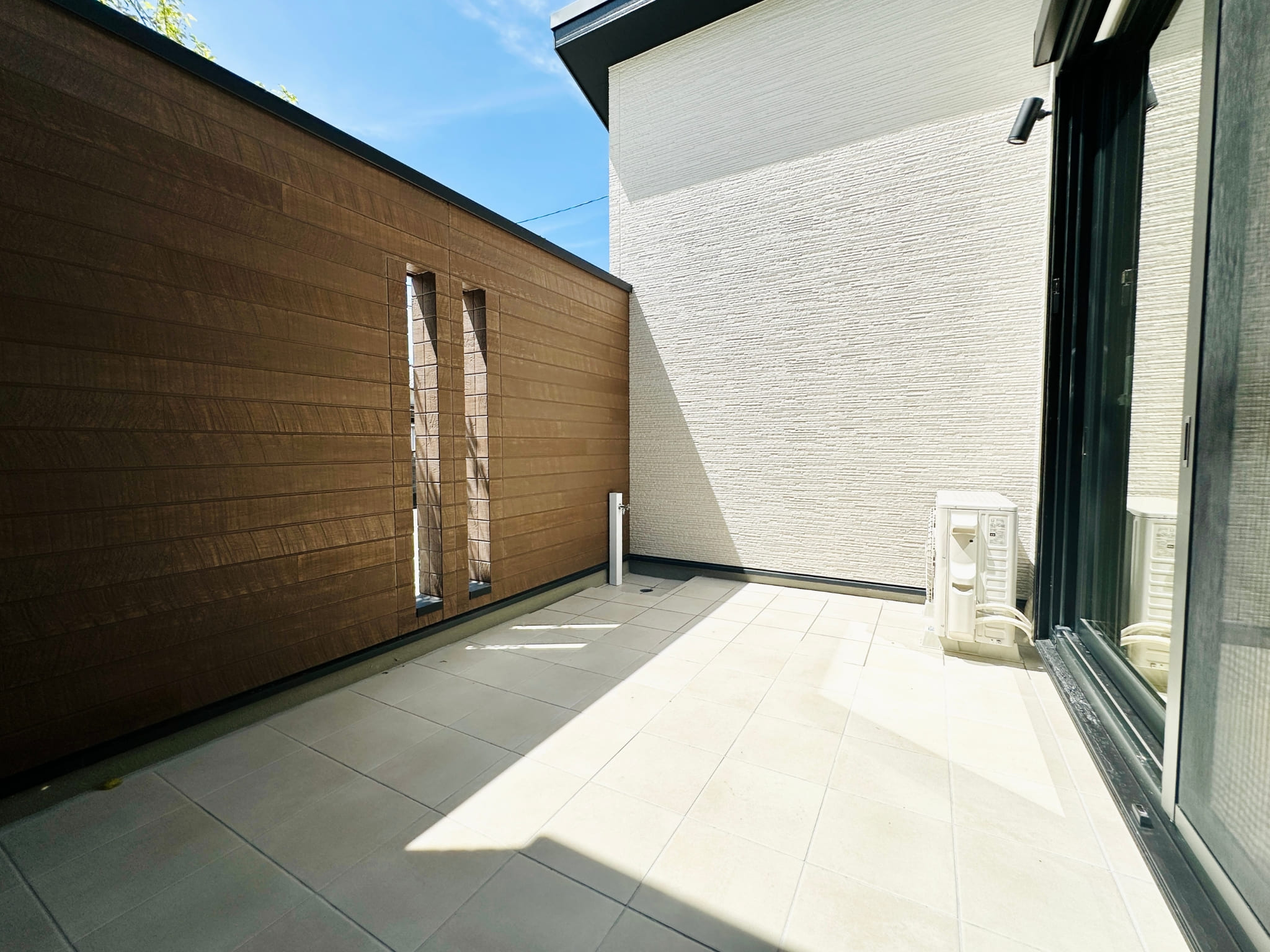 玄関からつながる約5帖のタイルデッキの中庭。休日には家族で食事を楽しんだり、夜には星空を眺めたり。ファサード壁に守られた安心感のある空間は、住まいに特別なひとときを添えます。