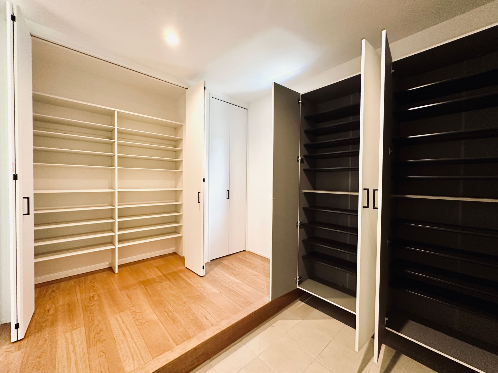 約5帖の玄関ホールに設けられた十分な収納計画。空間の美しさと機能性を両立させ、常に整然とした住まいを実現します。常にすっきりとした空間で急な来客時でも安心です。
