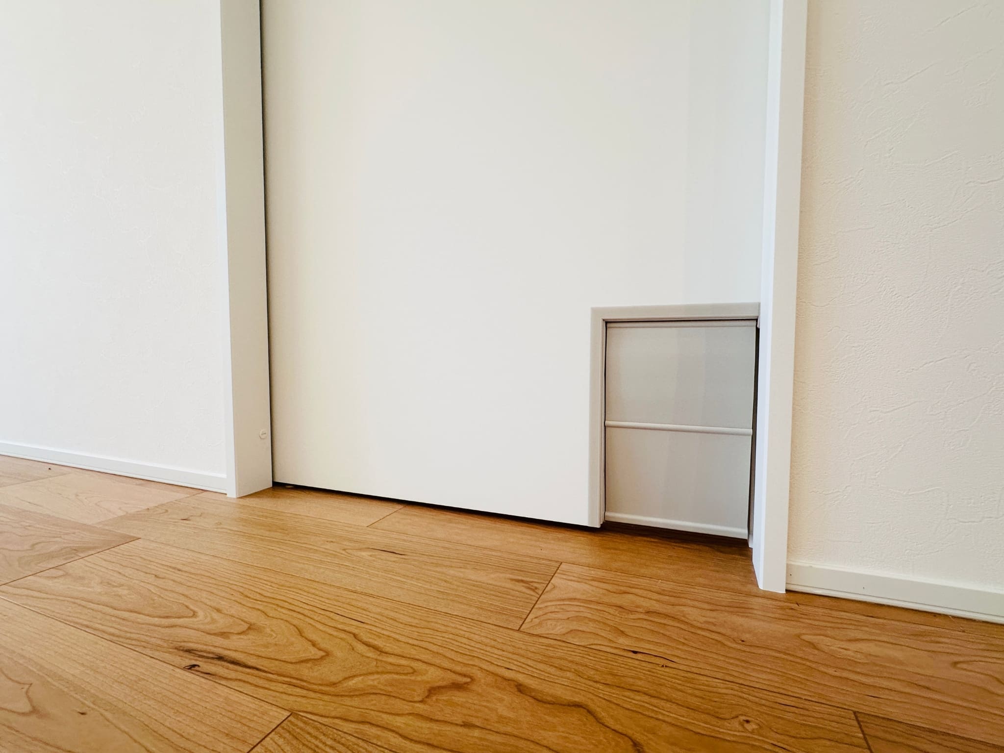 二階へ上がるドアには、猫ちゃん用の小さなドアを設置。家族のペットも自由に行き来できる、暮らしに寄り添った工夫がされています。