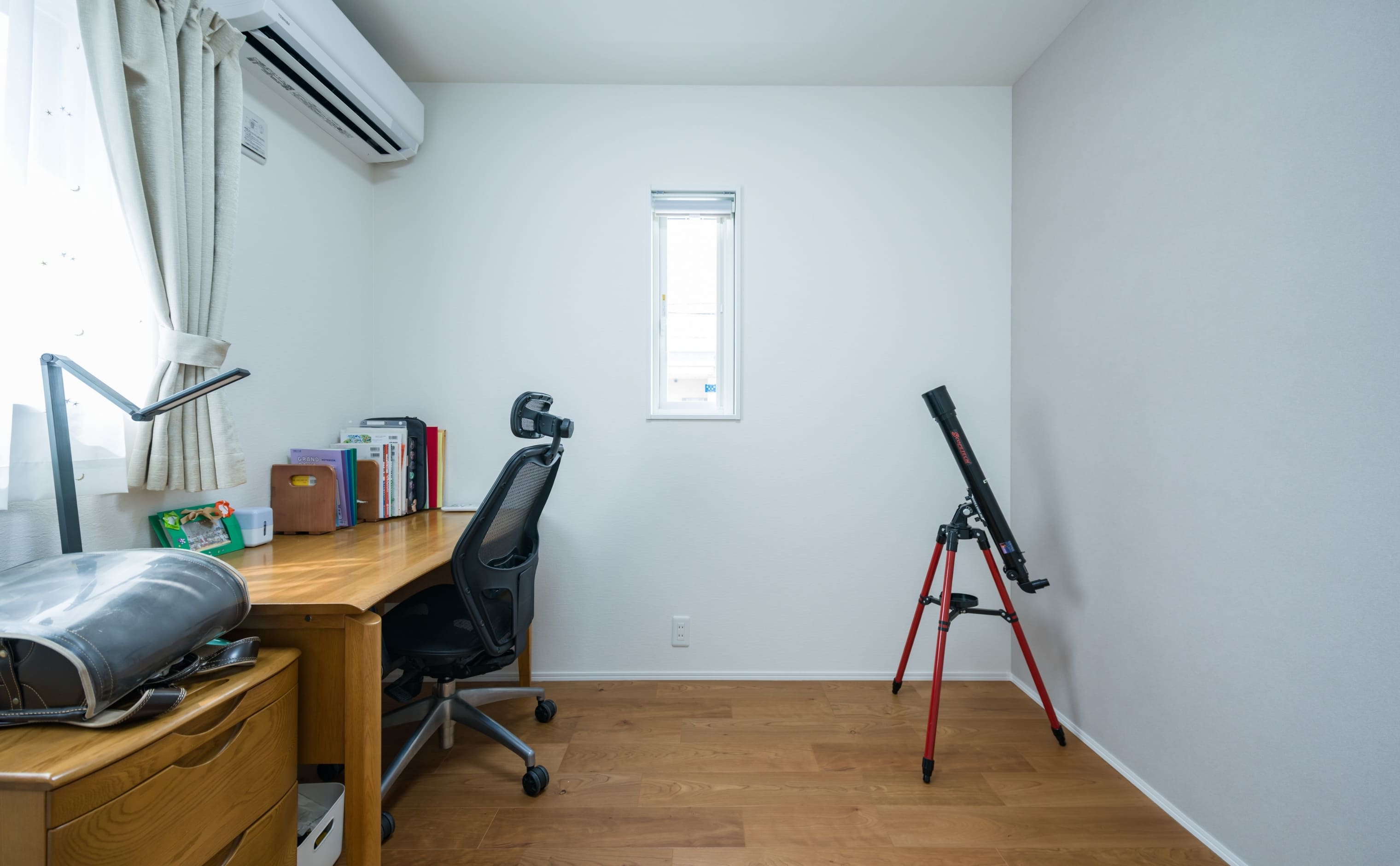 5.2帖の子ども部屋は、窓からの自然光が心地よく届く、明るく落ち着いた空間。木製のデスクやチェアで学習環境を整え、天体望遠鏡などお子さまの興味を広げるアイテムも似合う空間に。すっきりとしたシンプルな設えが集中力を高めてくれます。