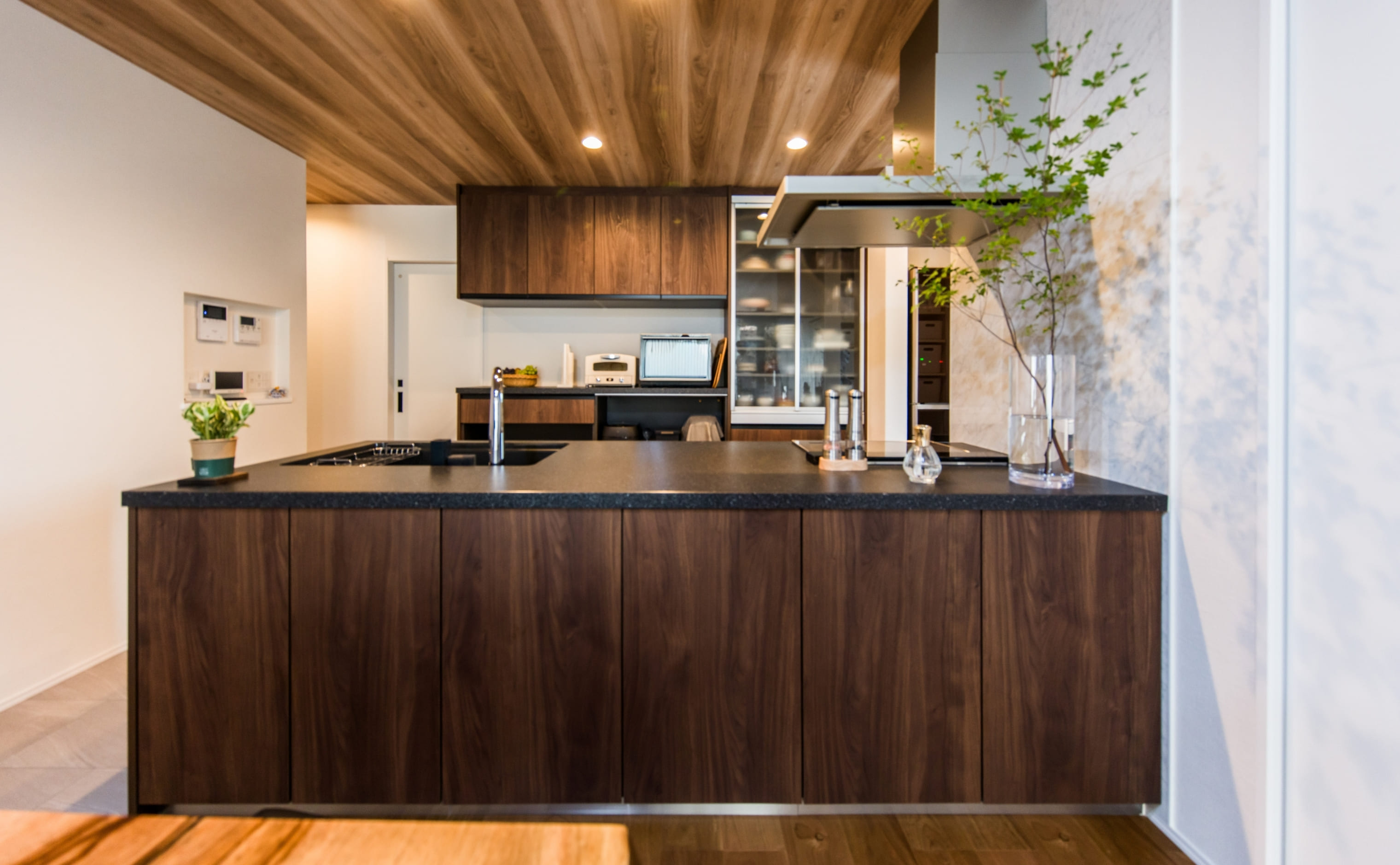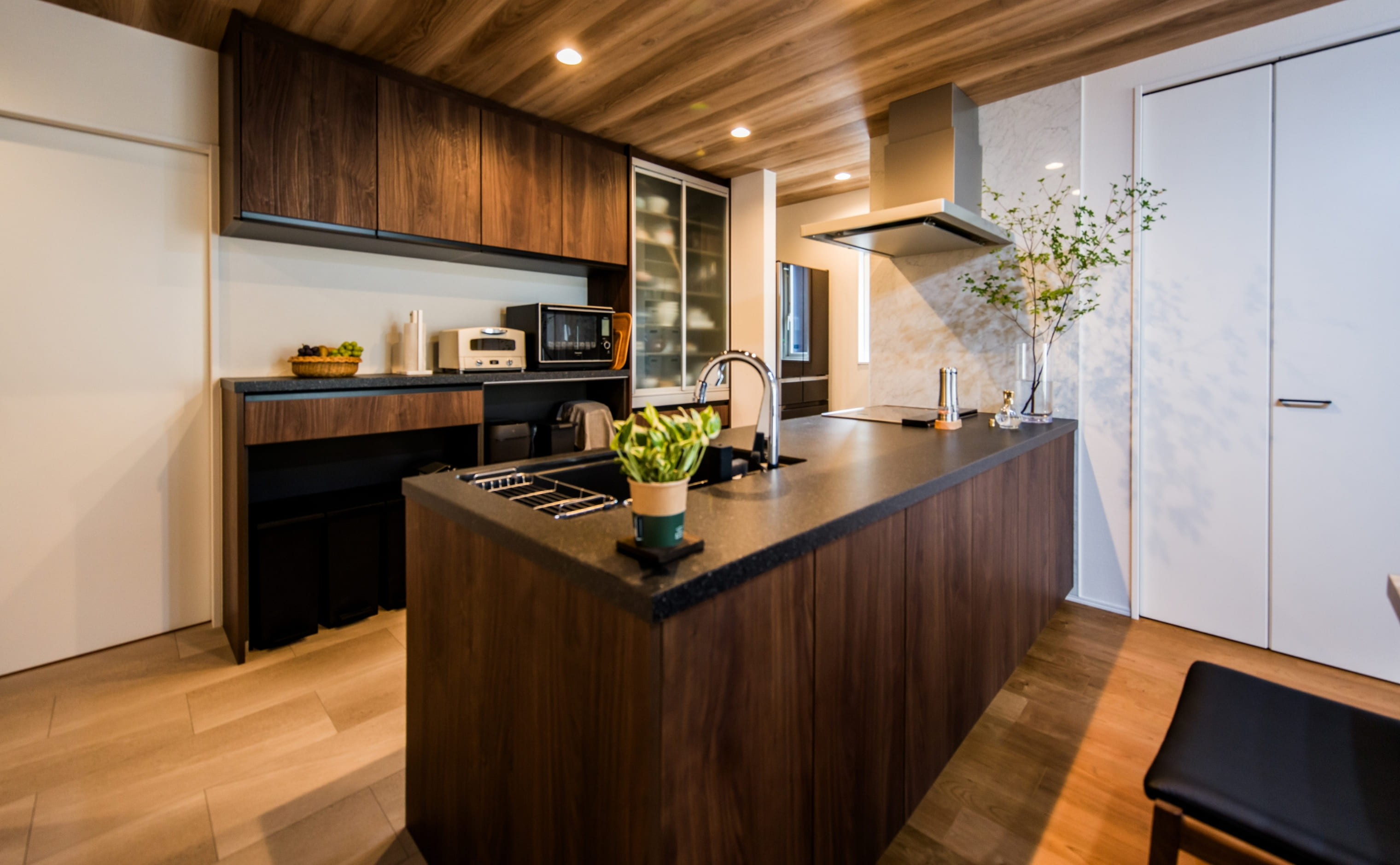 キッチンは、パナソニック最上位シリーズ「L-CLASS(エルクラス)」を採用。木目の扉や黒の天板との相性も良く、統一感ある上質な空間を演出しています。生活感を抑えつつも、実際に使いやすいキッチンを目指した工夫が随所に感じられ、「見せる美しさ」と「隠す機能性」が絶妙にバランスの取れています。