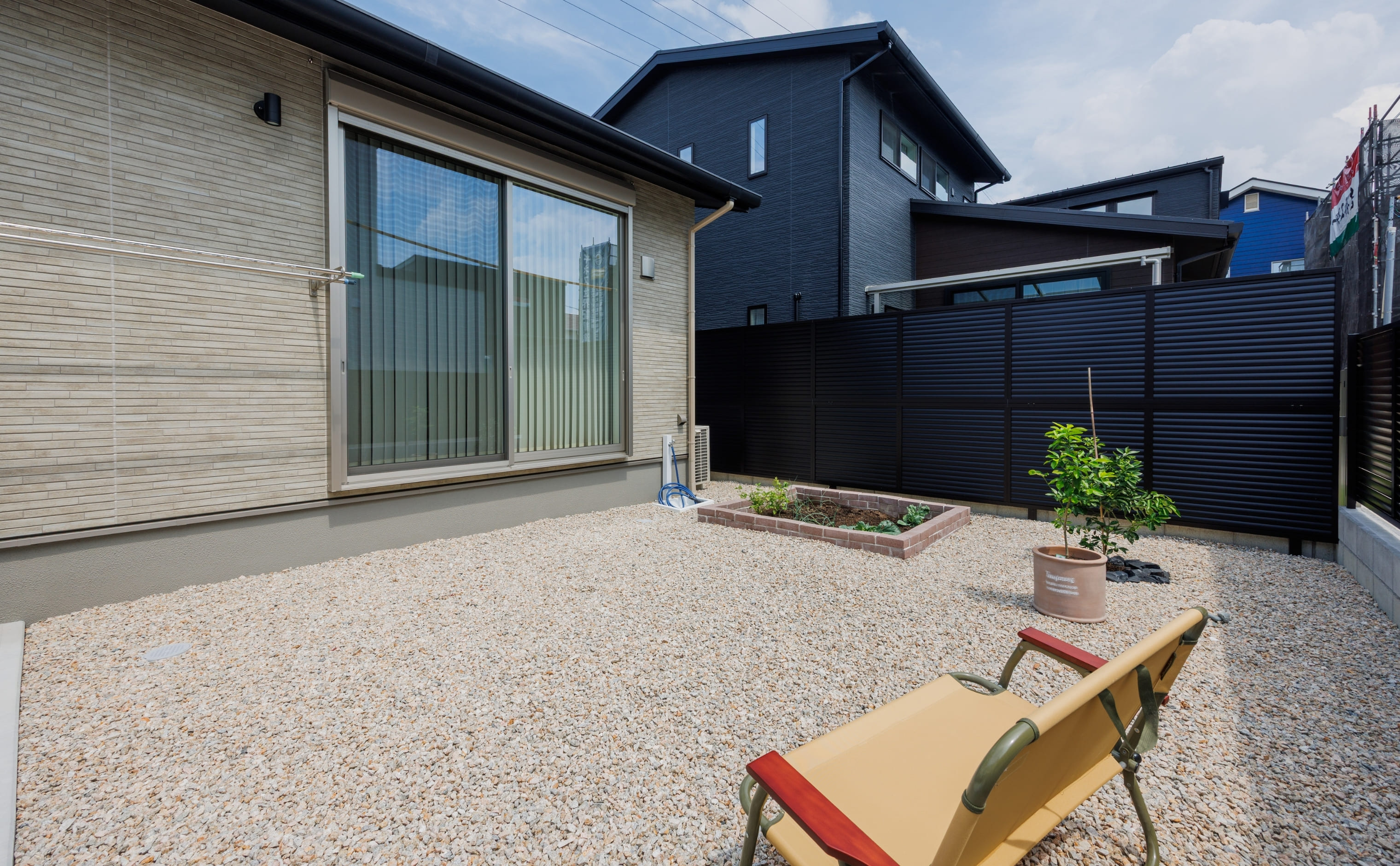 敷地いっぱいに広がる明るい砂利敷きの庭は、椅子を出してくつろいだり、お子さまと遊んだりと多目的に活用可能。家庭菜園スペースや目隠しフェンスも設けられており、外からの視線を気にせず、家族で楽しめる場所になっています。