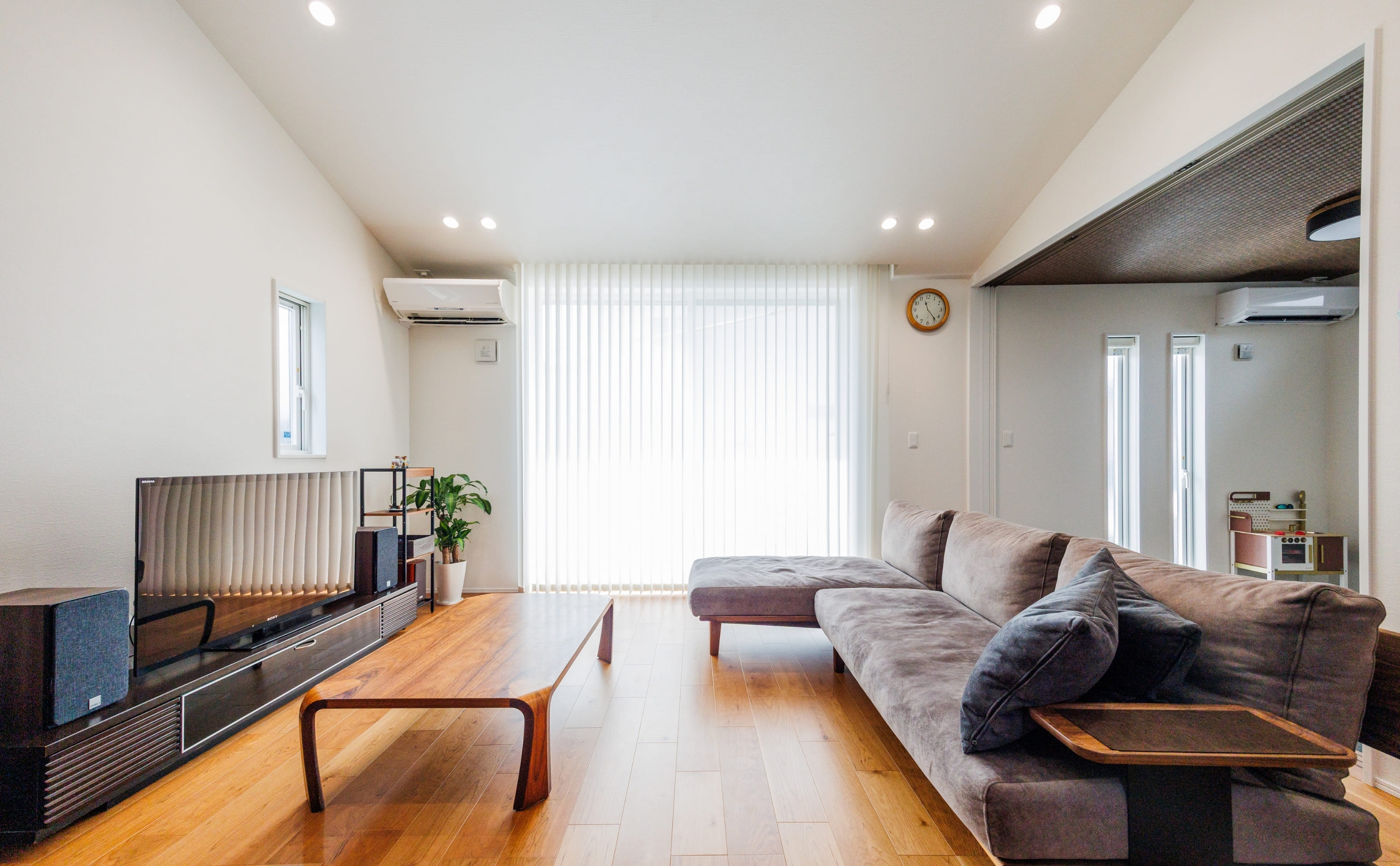 26.3帖のゆとりあるLDKには、ピアノやギターが美しく配置され、音楽が身近に感じられる空間に。木目天井と調和した優しい雰囲気の中、家族が自然と集まりたくなる心地よさに包まれています。