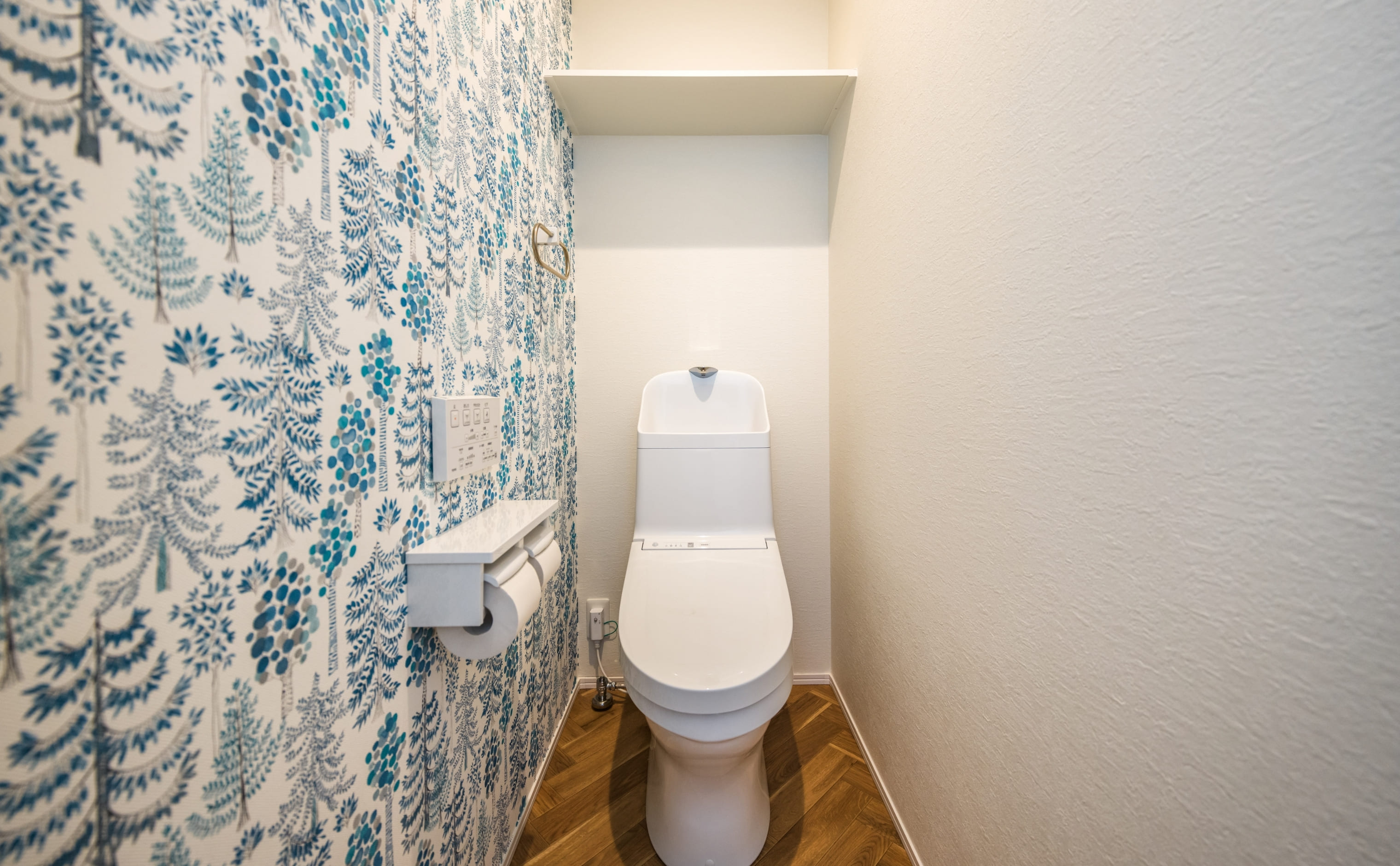 壁一面に広がるのは、まるで絵本の世界を思わせる森のデザインクロス。落ち着いたブルー系のトーンが爽やかで、清潔感も演出。限られた空間に遊び心と癒しが感じられる印象的なトイレに仕上がっています。