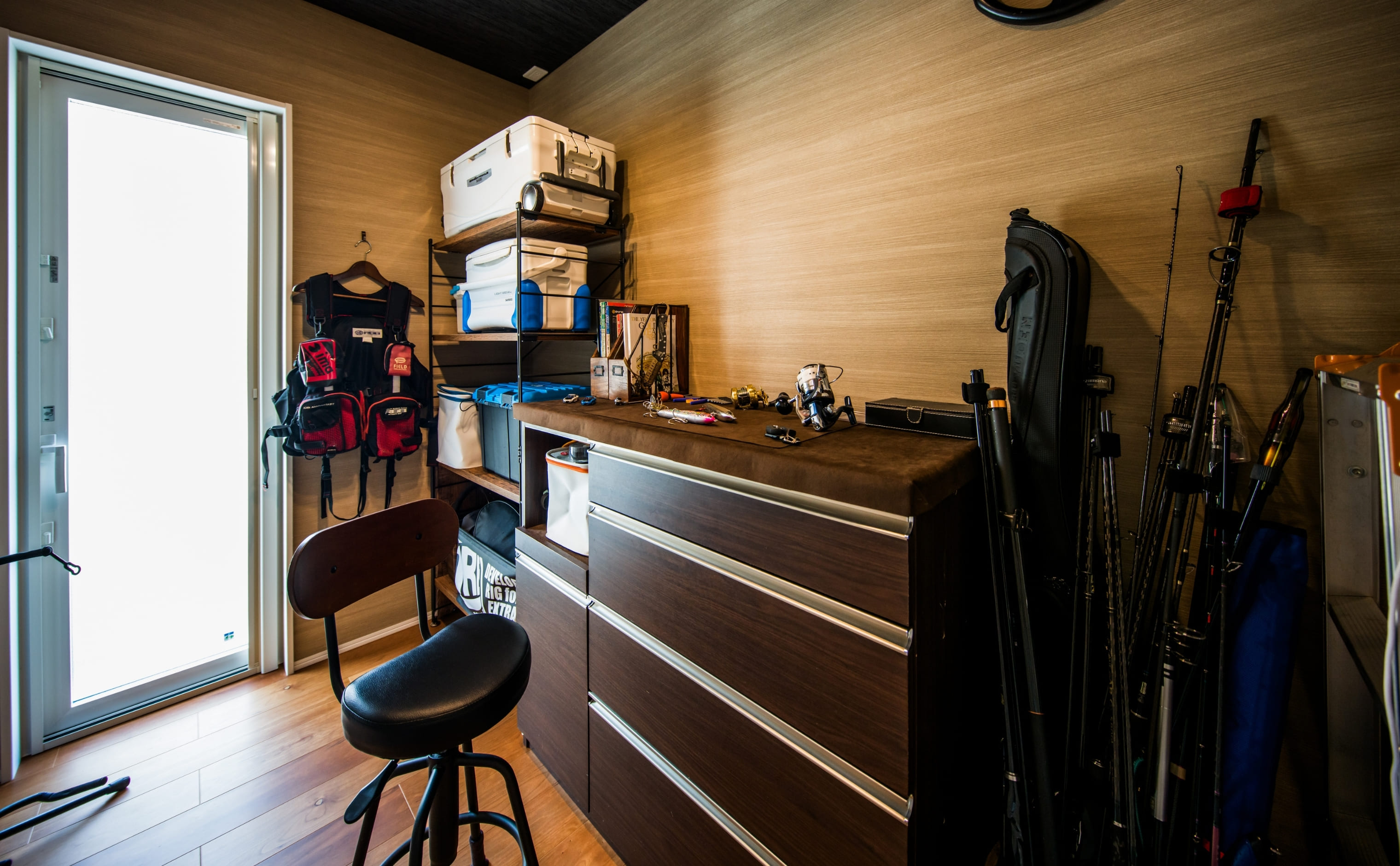 「家を建てるなら、いつか秘密基地のような空間をつくりたい」——そんな想いから実現した、こだわりの3帖の釣り部屋。広めのカウンターでは、ルアーの針交換や釣り具のメンテナンスも快適に。