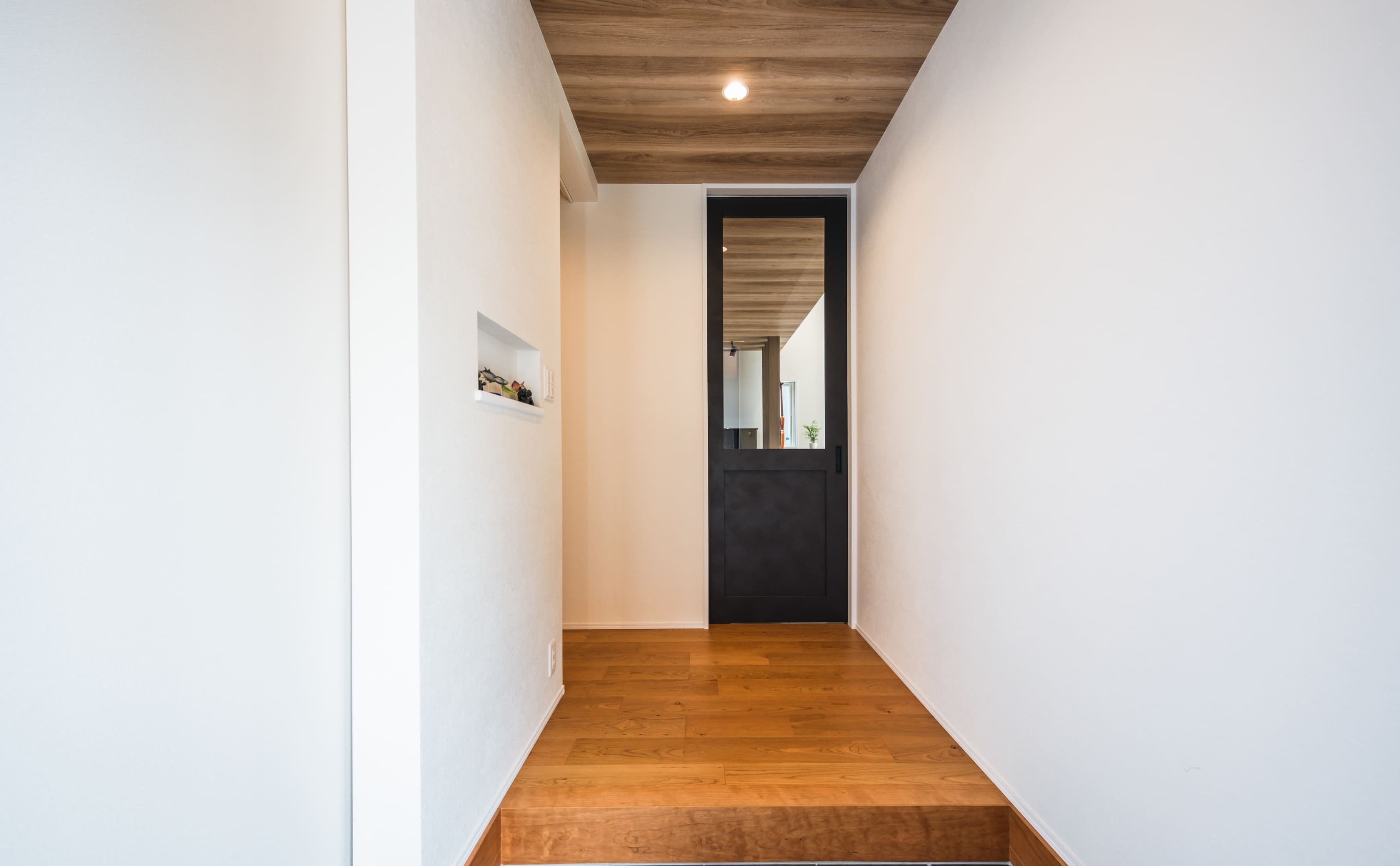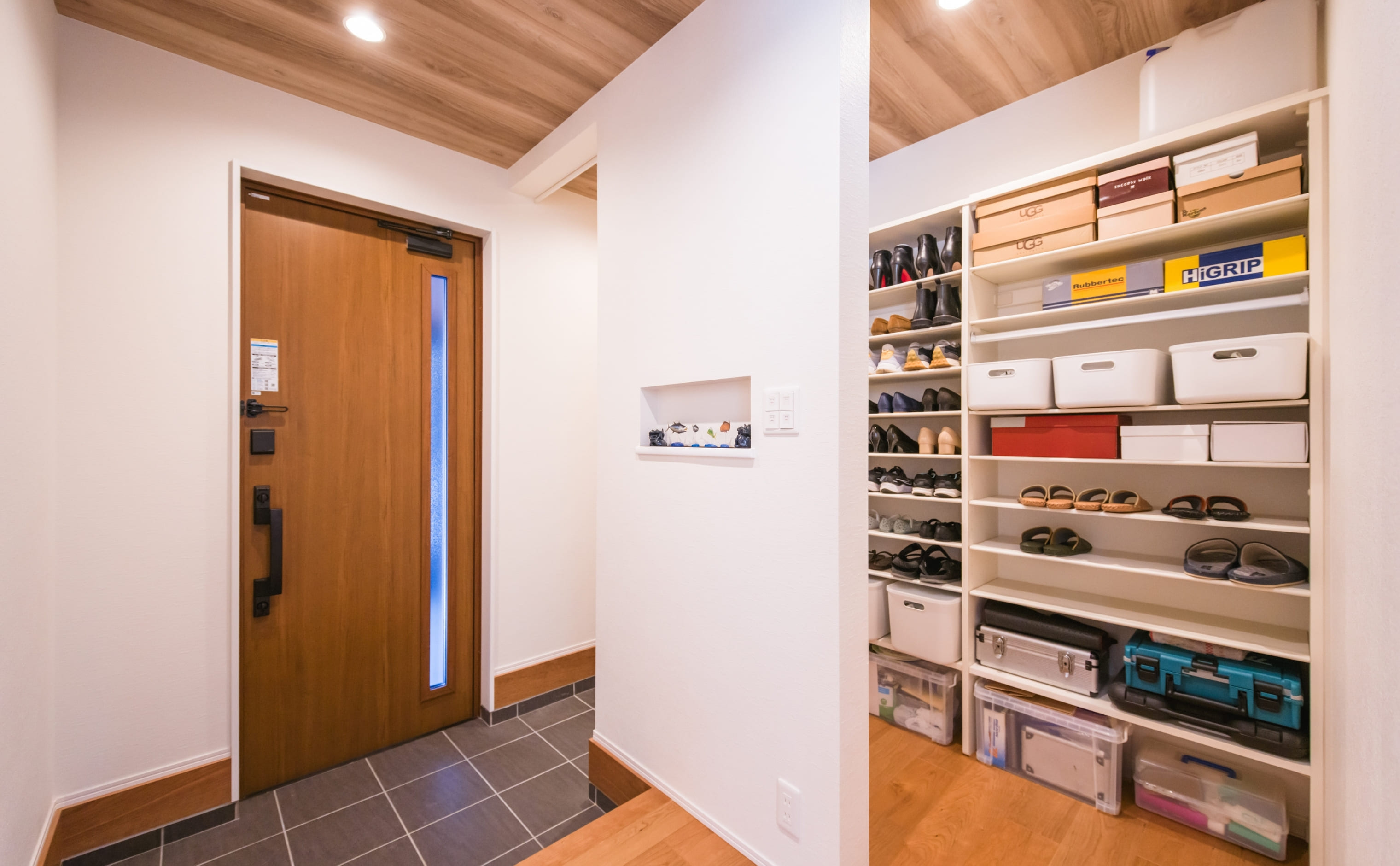 キャラメルチーク色の玄関ドアがやさしく迎える玄関ホール。ニッチには釣り小物を飾り、趣味の彩りを添えています。隣接するシューズクローゼットは収納力も十分で、空間は常にすっきりと保たれています。