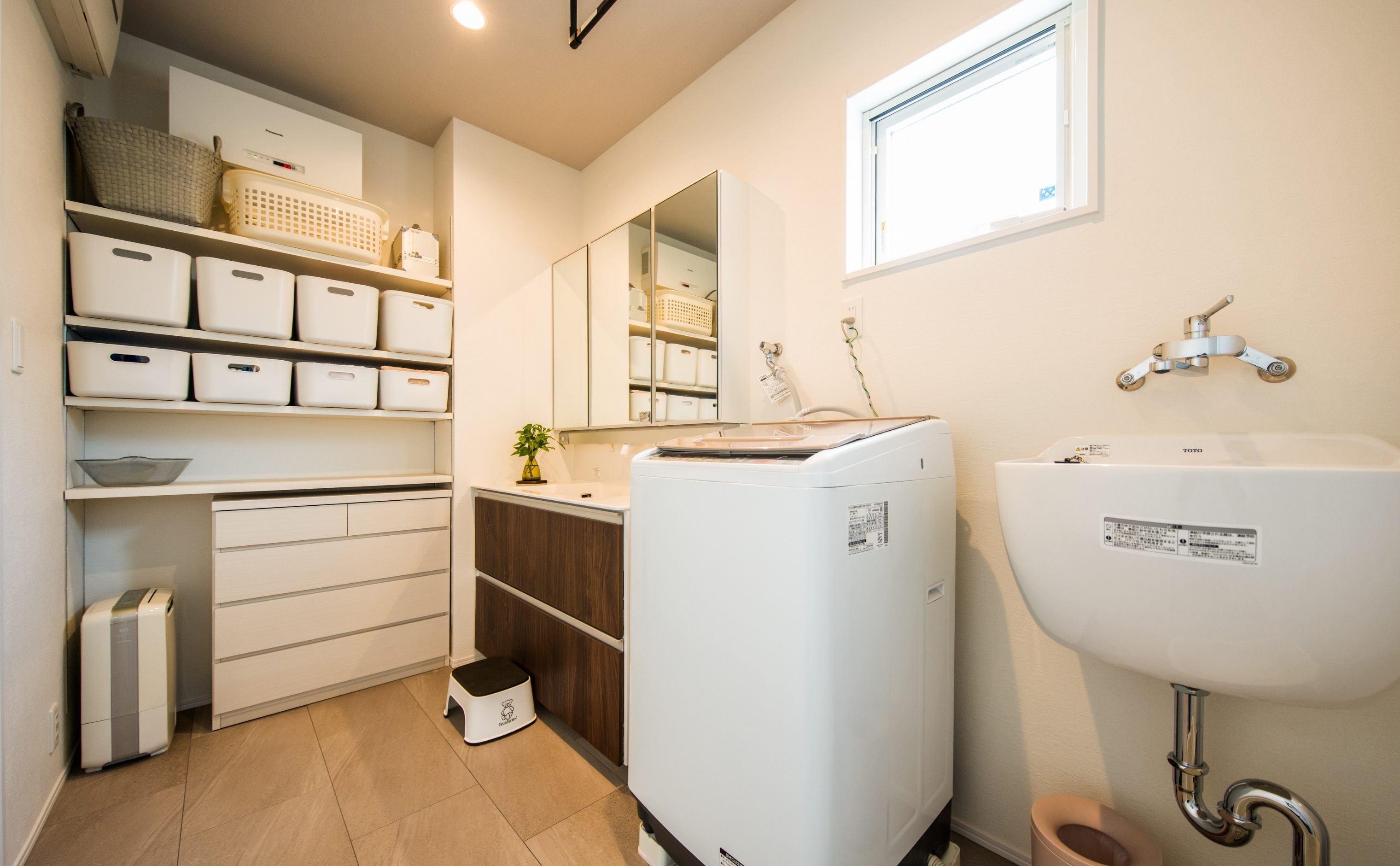 1.75帖の効率的に使えるランドリールーム。棚には収納ボックスが整然と並び、空間がすっきりと保たれています。天井付けの物干しバーも設置され、洗濯〜乾燥〜収納までがスムーズに完結。家事が快適になる工夫が詰まった空間です。