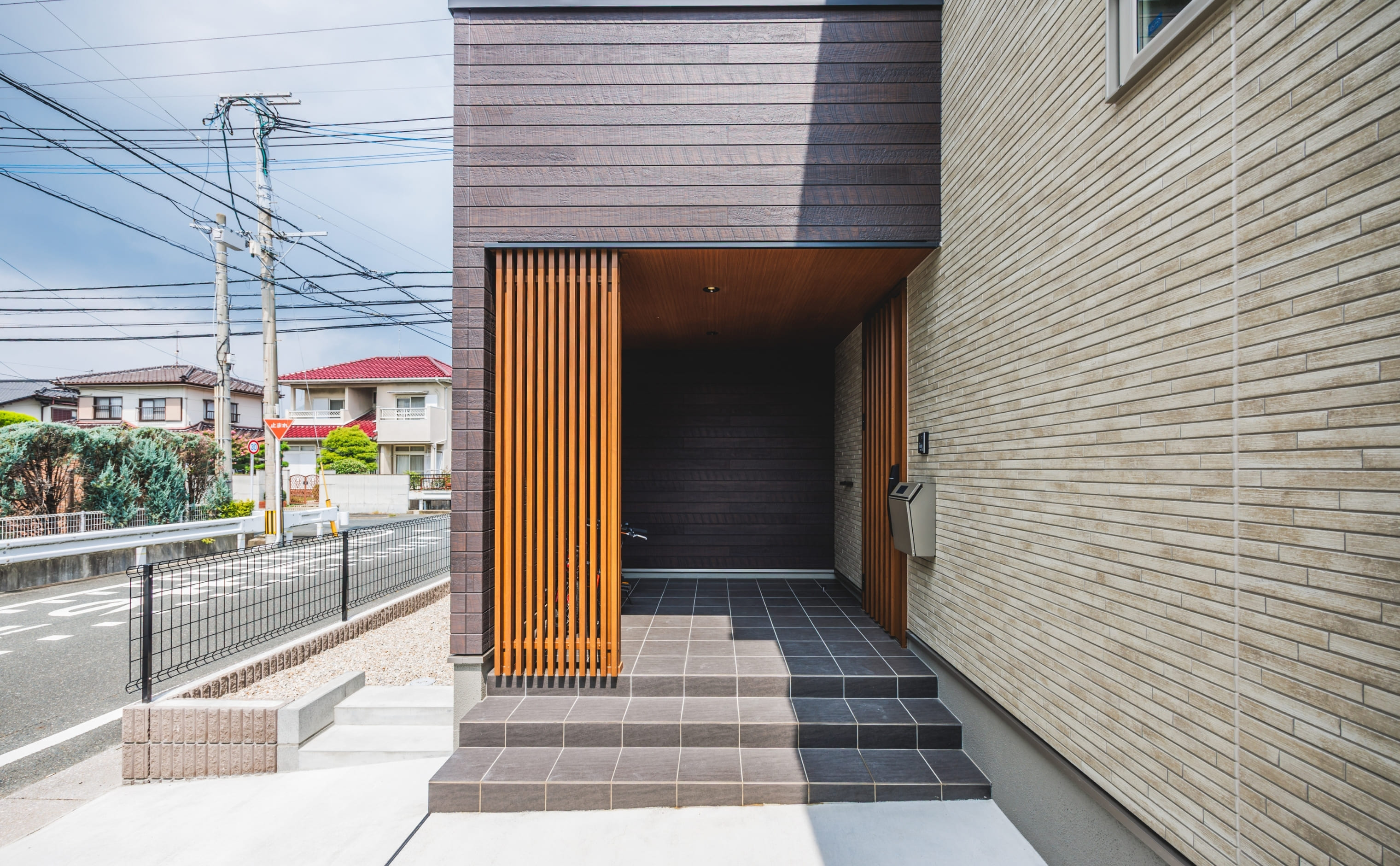 玄関ポーチには木目調の縦格子を設け、外からの視線をやわらげながらも開放感を確保。和の趣と落ち着きを感じさせる、上品な玄関まわりを演出しています。