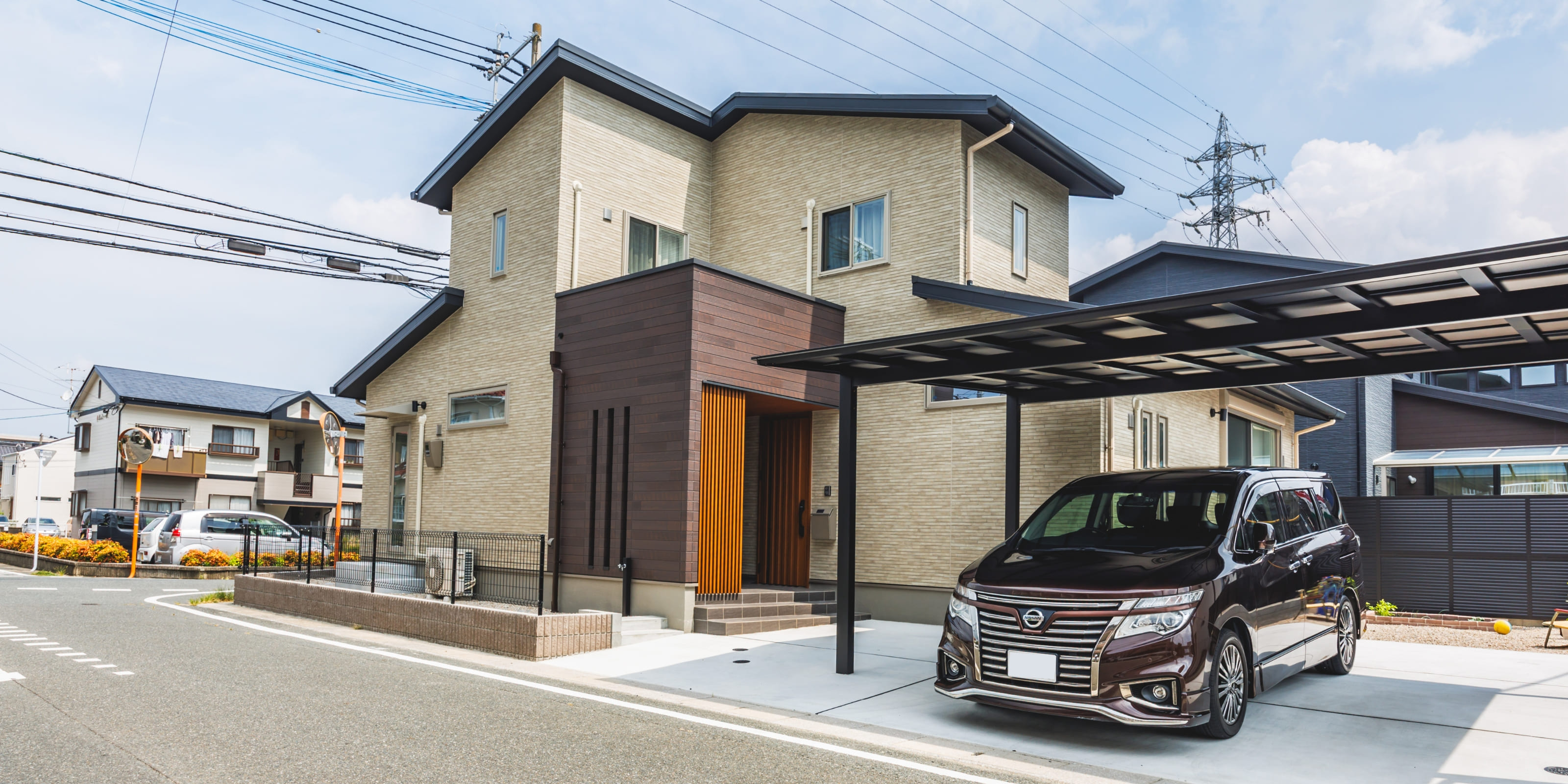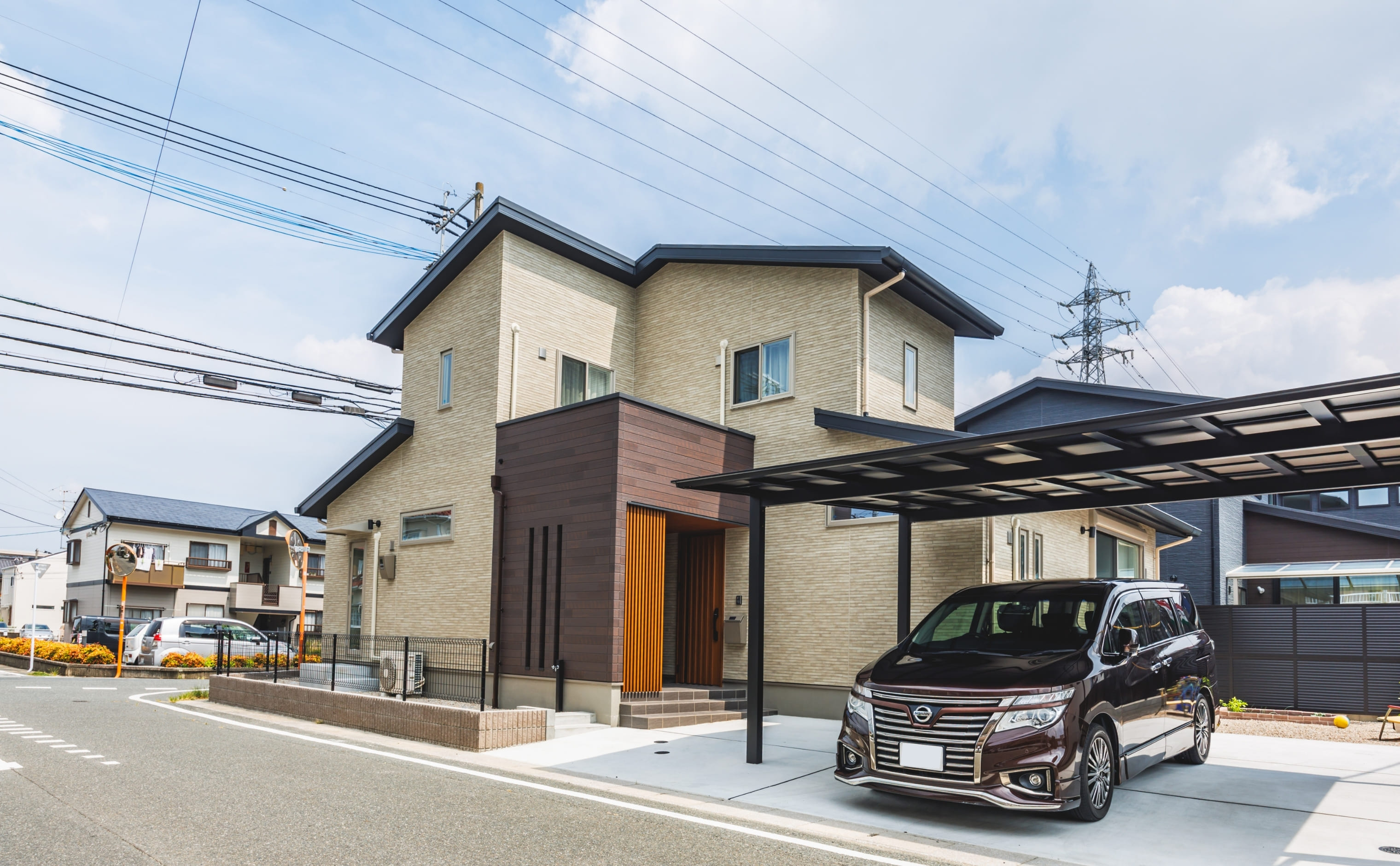 外壁には、落ち着きのあるベージュ系のカラーを採用。周囲の景観とも調和し、優しい印象を与えてくれます。さらに、玄関まわりにはダークブラウンのアクセントをプラス。住まい全体に程よいコントラストを生み出しています。