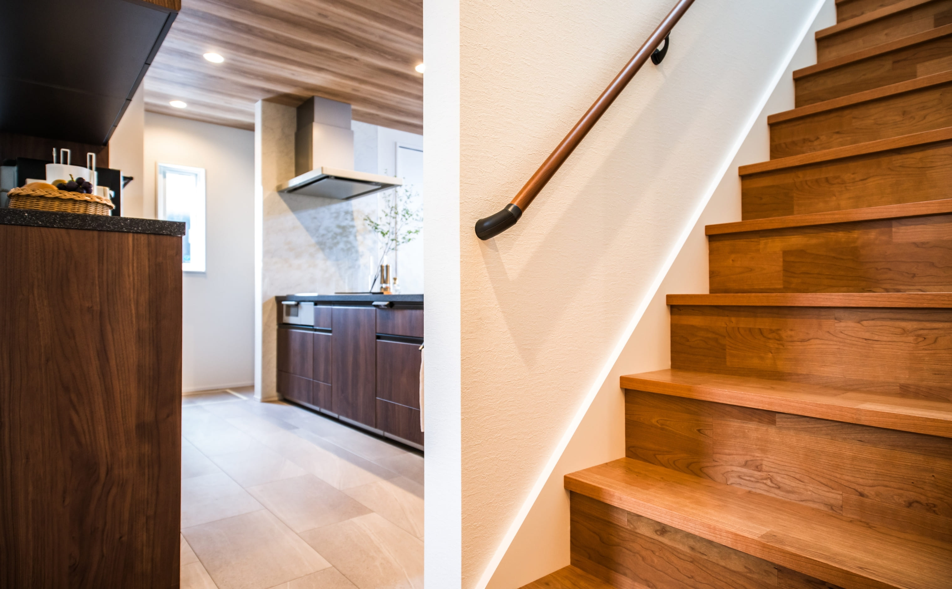 木目が美しい階段は、リビングと自然につながり住まい全体に温もりと統一感をもたらしています。光の入り方や素材の調和が、毎日の動線を心地よく演出します。