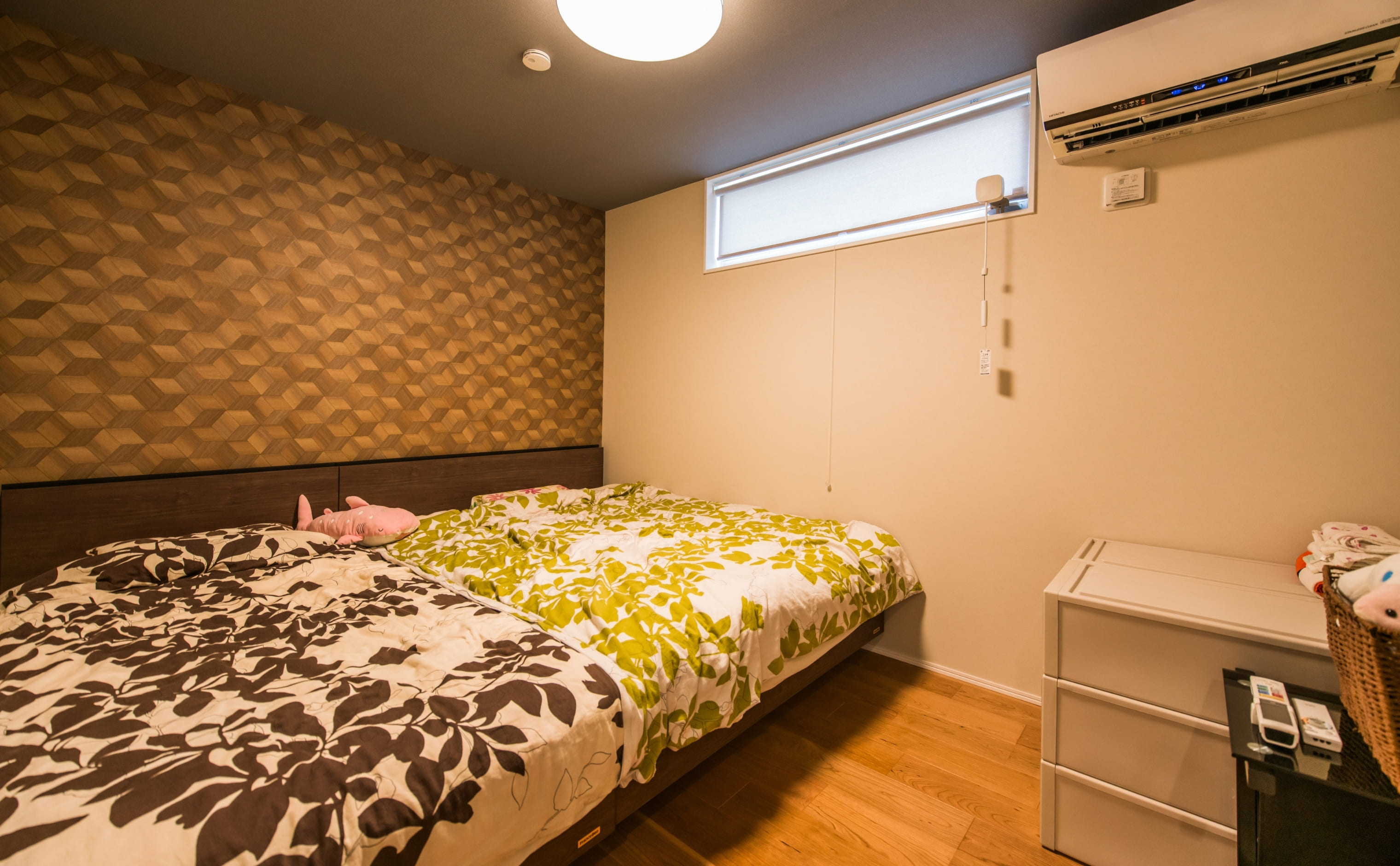 6帖の主寝室には、タイル状の木を組み合わせた六角形デザインのアクセントクロスを採用。さりげなく光るゴールドの目地が、空間に落ち着きと高級感をプラスしています。