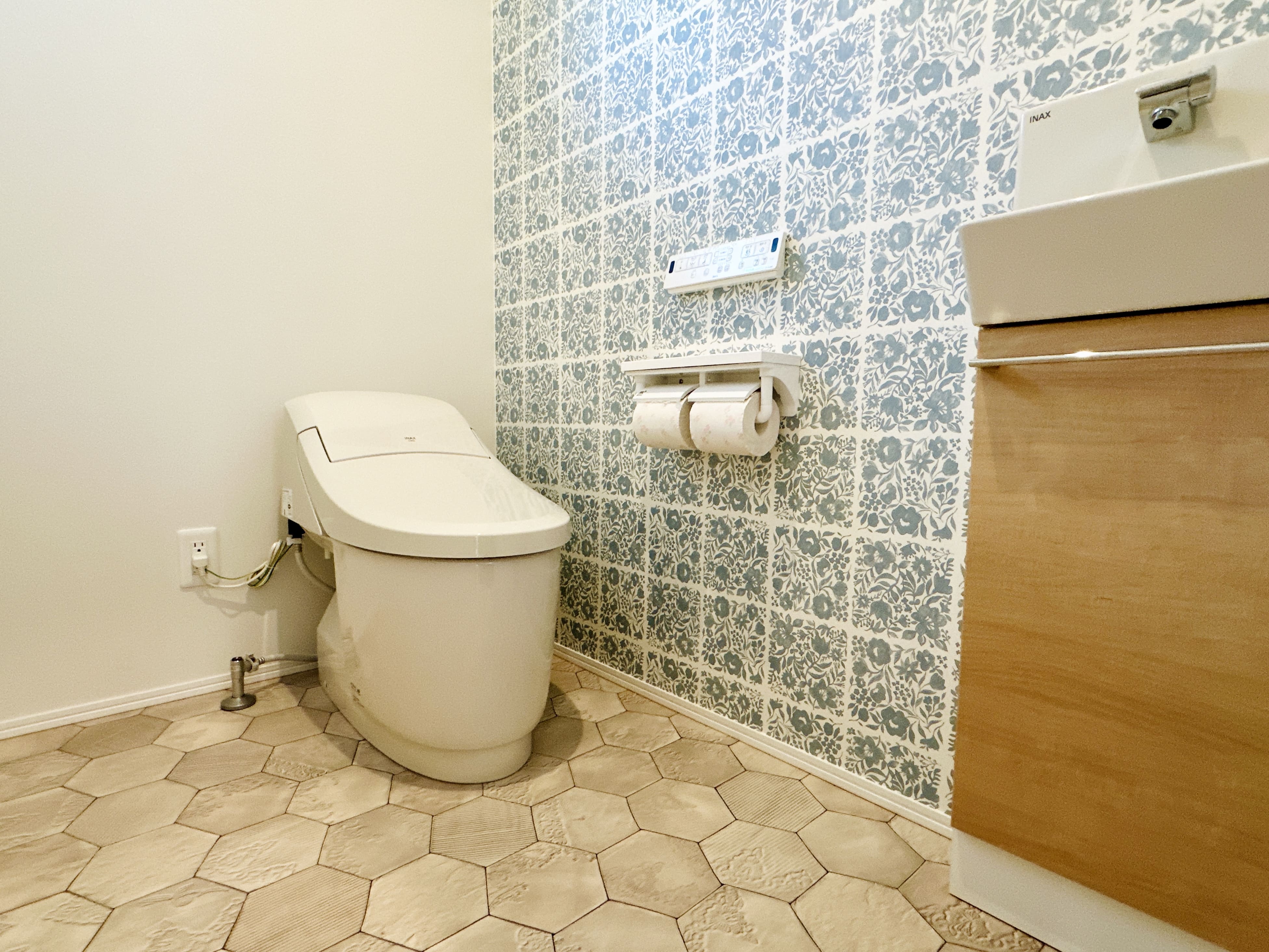 お手洗いもランドリールームと同じクロスでコーディネートし、空間ごとの役割は異なりながらも、住まい全体に統一感のあるデザインになっています。