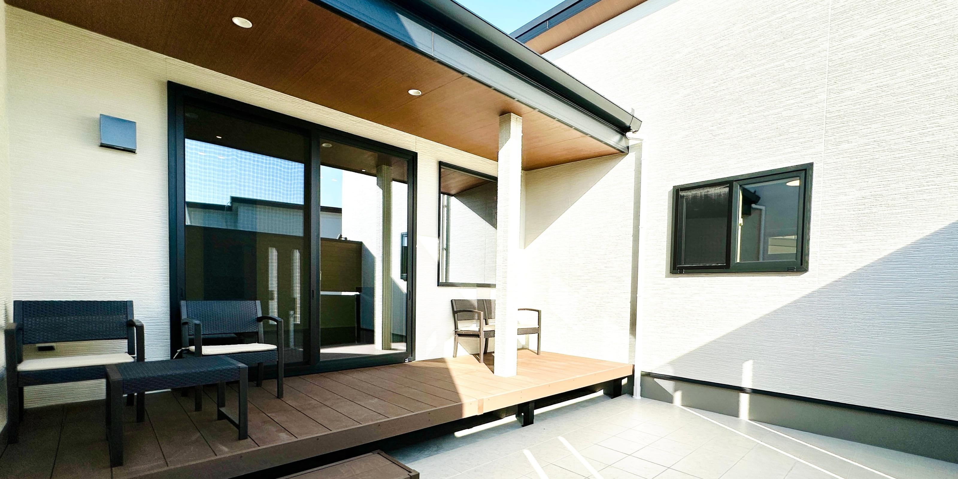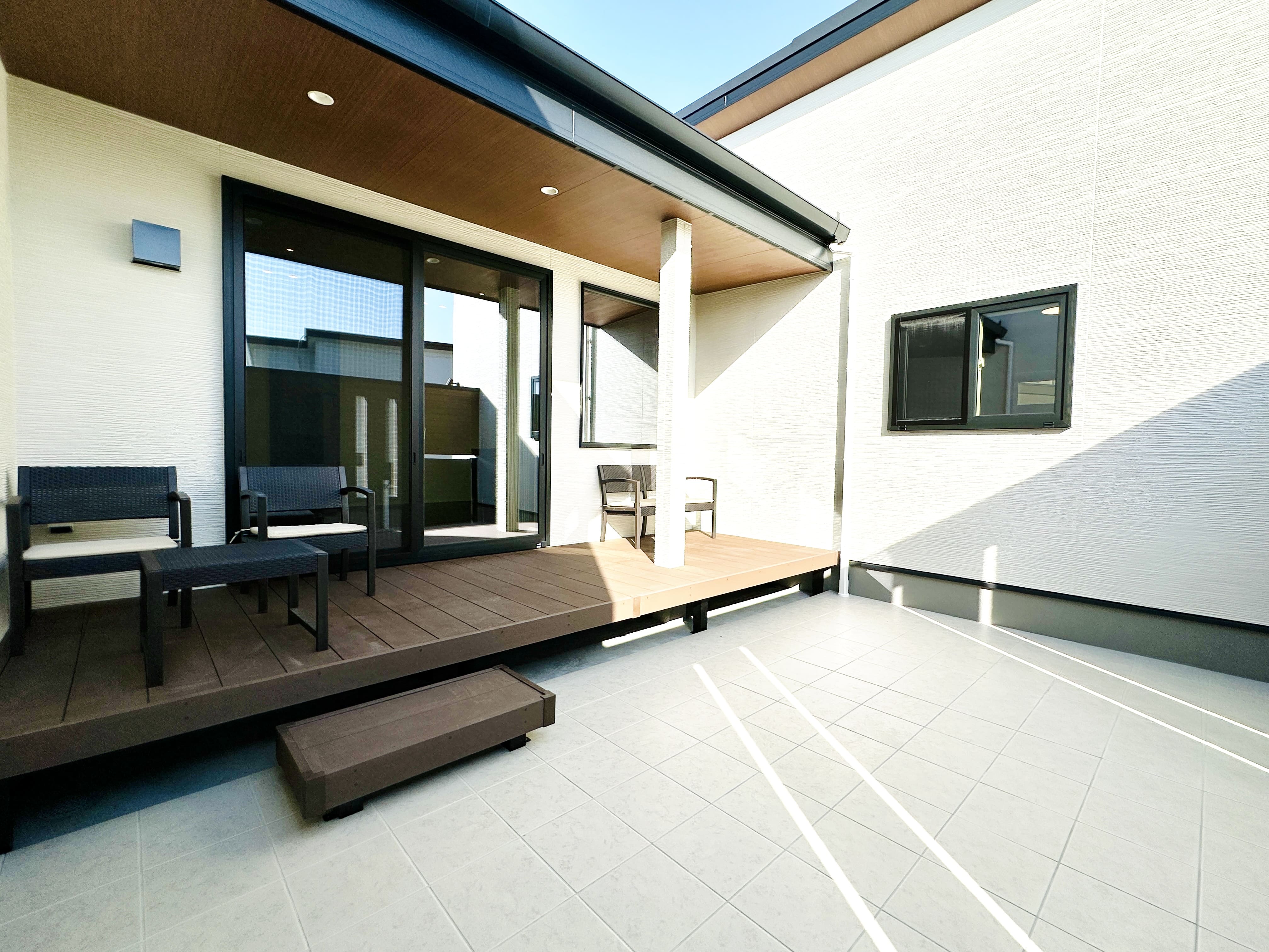 ウッドデッキにはベンチとテーブルを配置。モデルハウスで見たものと似たデザインのアイテムをセレクトし、屋外でのひとときをより快適に楽しめる空間としています。