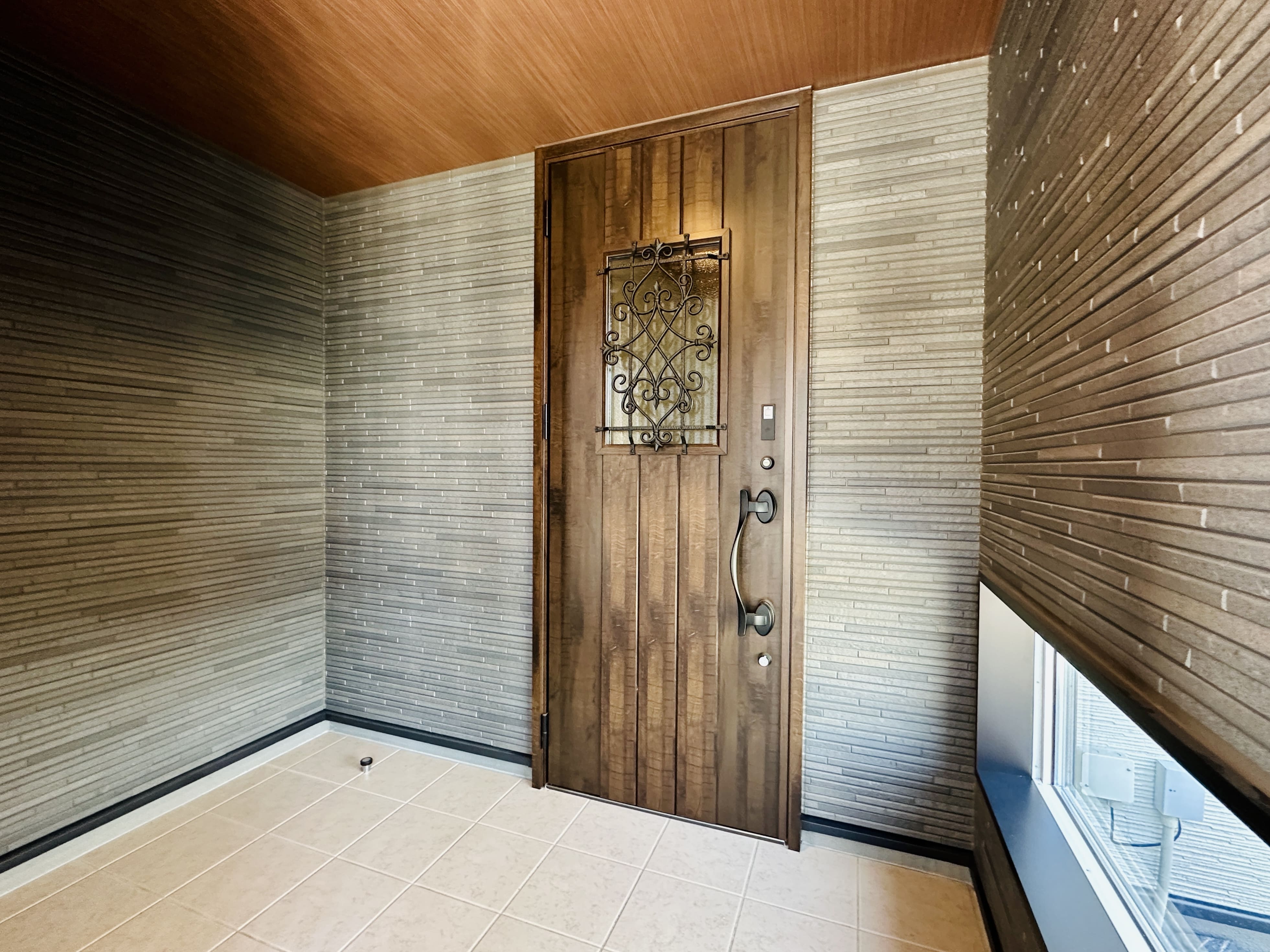 奥様が選ばれた、装飾アイアン入りガラスが印象的な玄関ドア。木目の風合いに、やさしい光が美しく映えます。