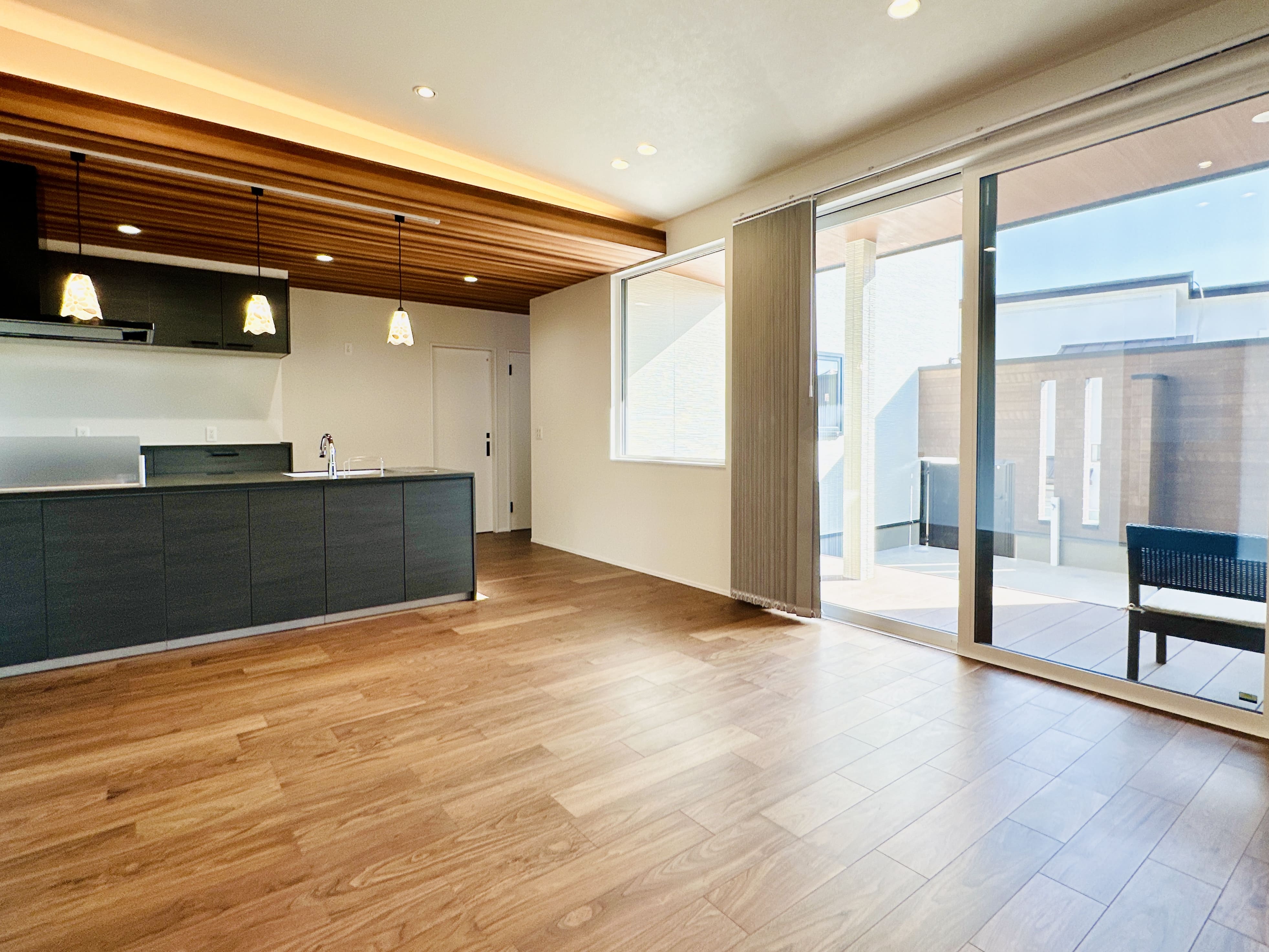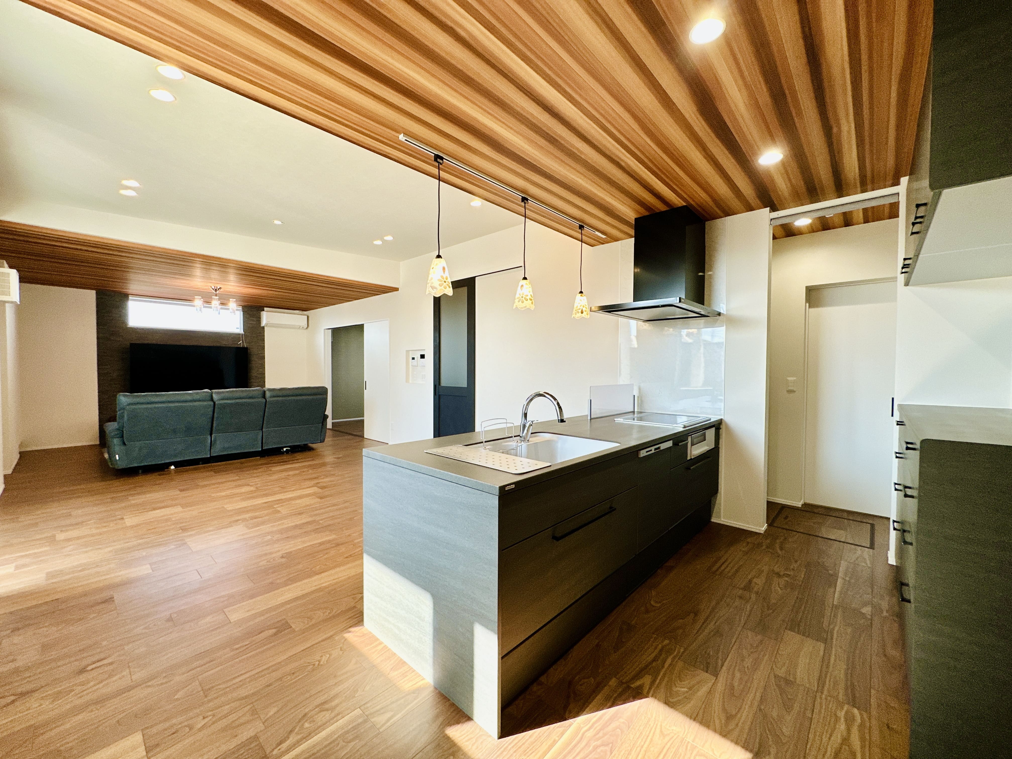 24.7帖の開放的なLDK。木目の天井がやさしい表情を生み、ダークグレーのフルフラットキッチンが空間を引き締め、上質な雰囲気を演出しています。