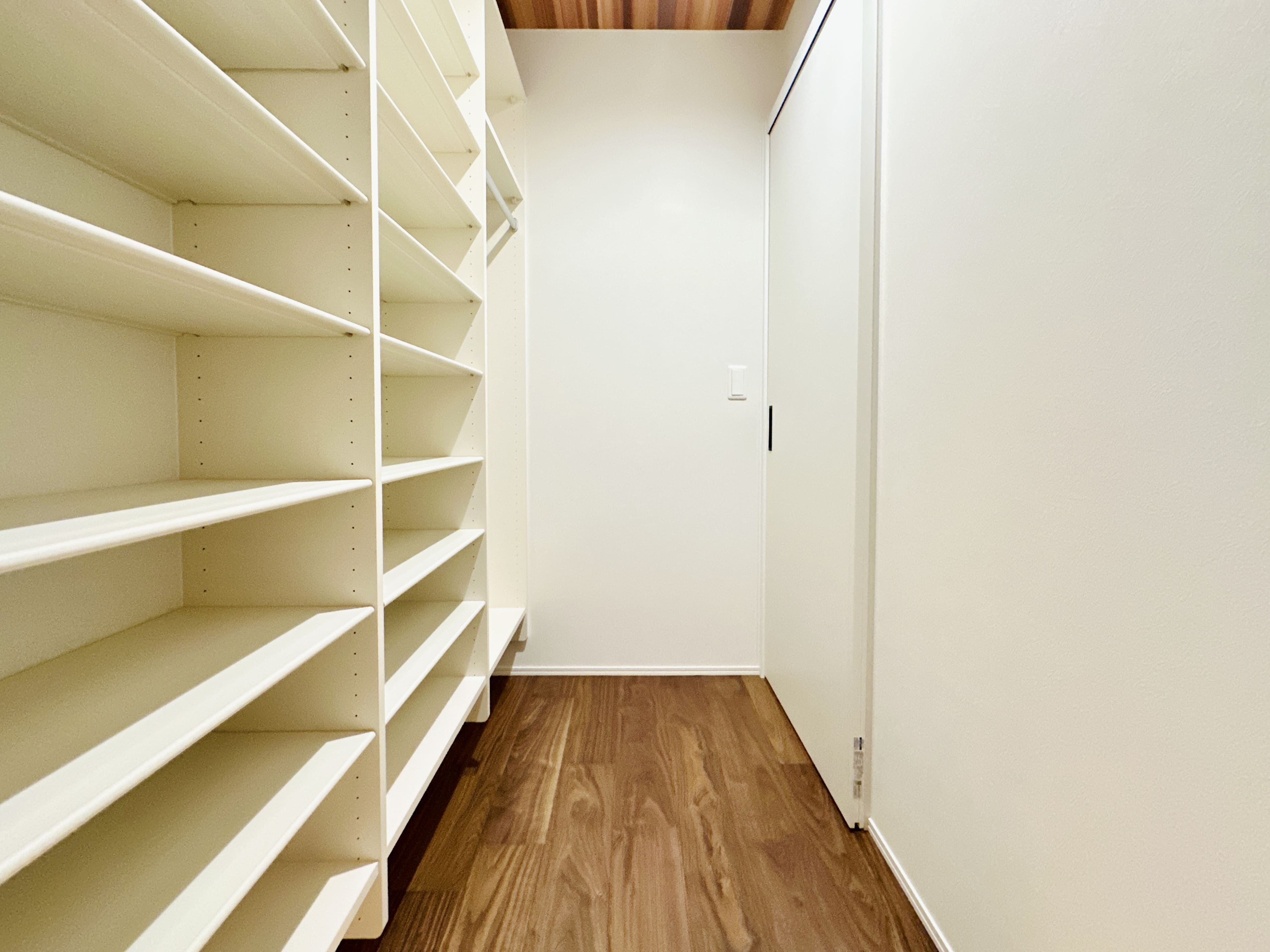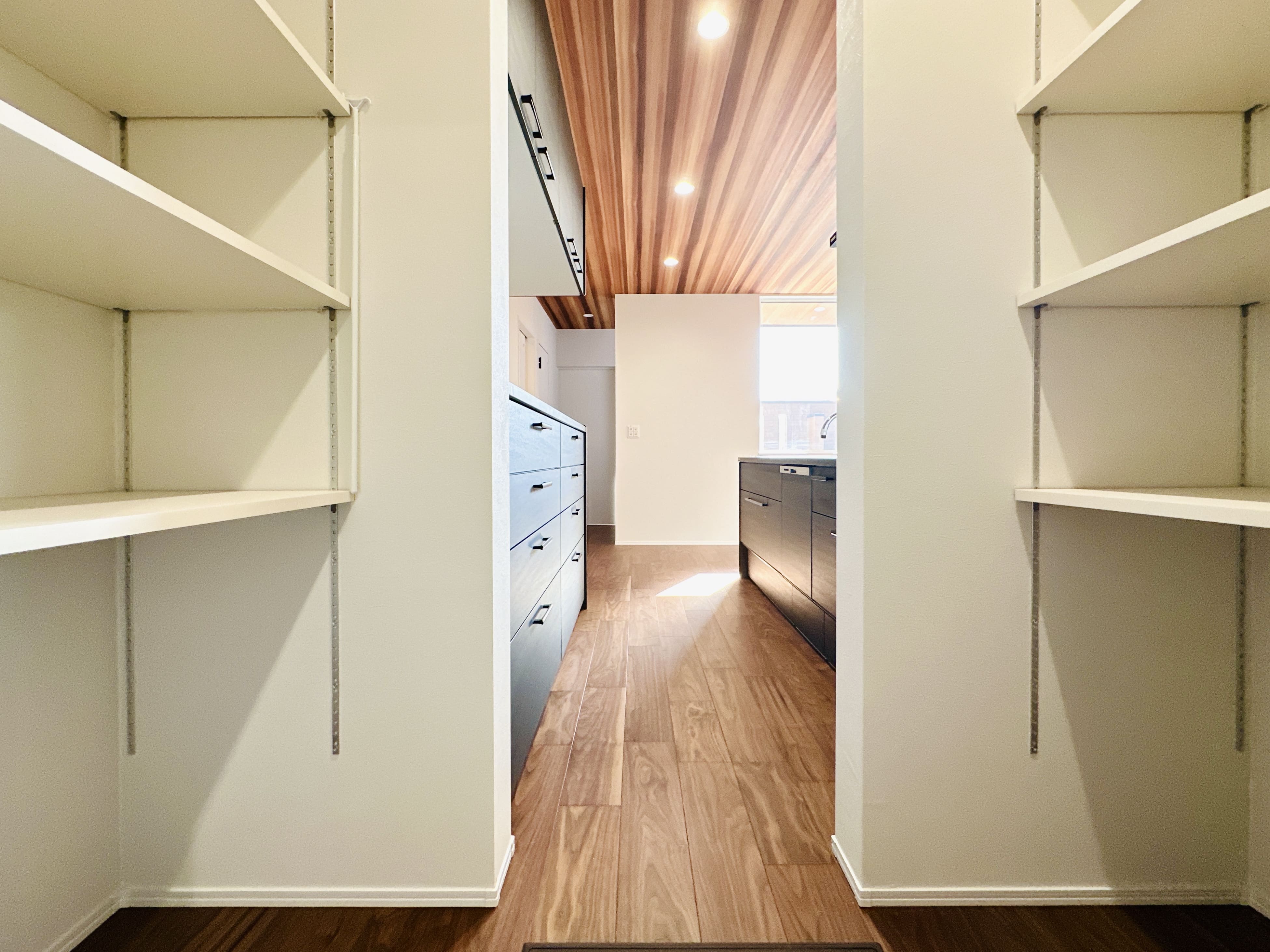 土間収納からキッチンへと直接つながり、パントリーも併設。買い物後はそのまま食材や日用品を収納でき、家事の負担を軽減します。