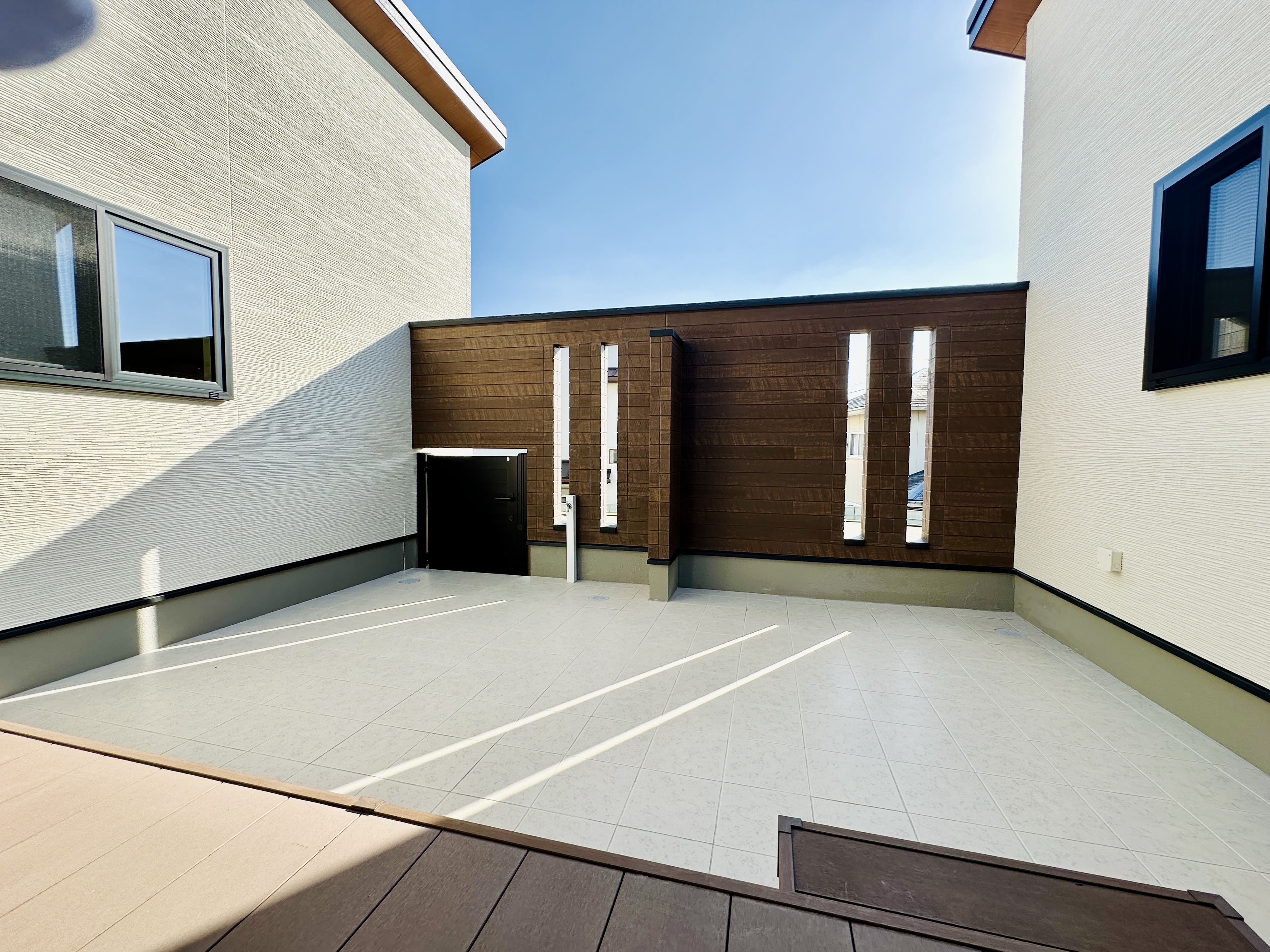 ファサード壁で囲まれた18帖の中庭は、外からの視線をやわらかく遮りながら、光と風を取り込む設え。室内と緩やかにつながり、家族が思い思いにくつろげる、開放感とプライバシーを両立した空間です。