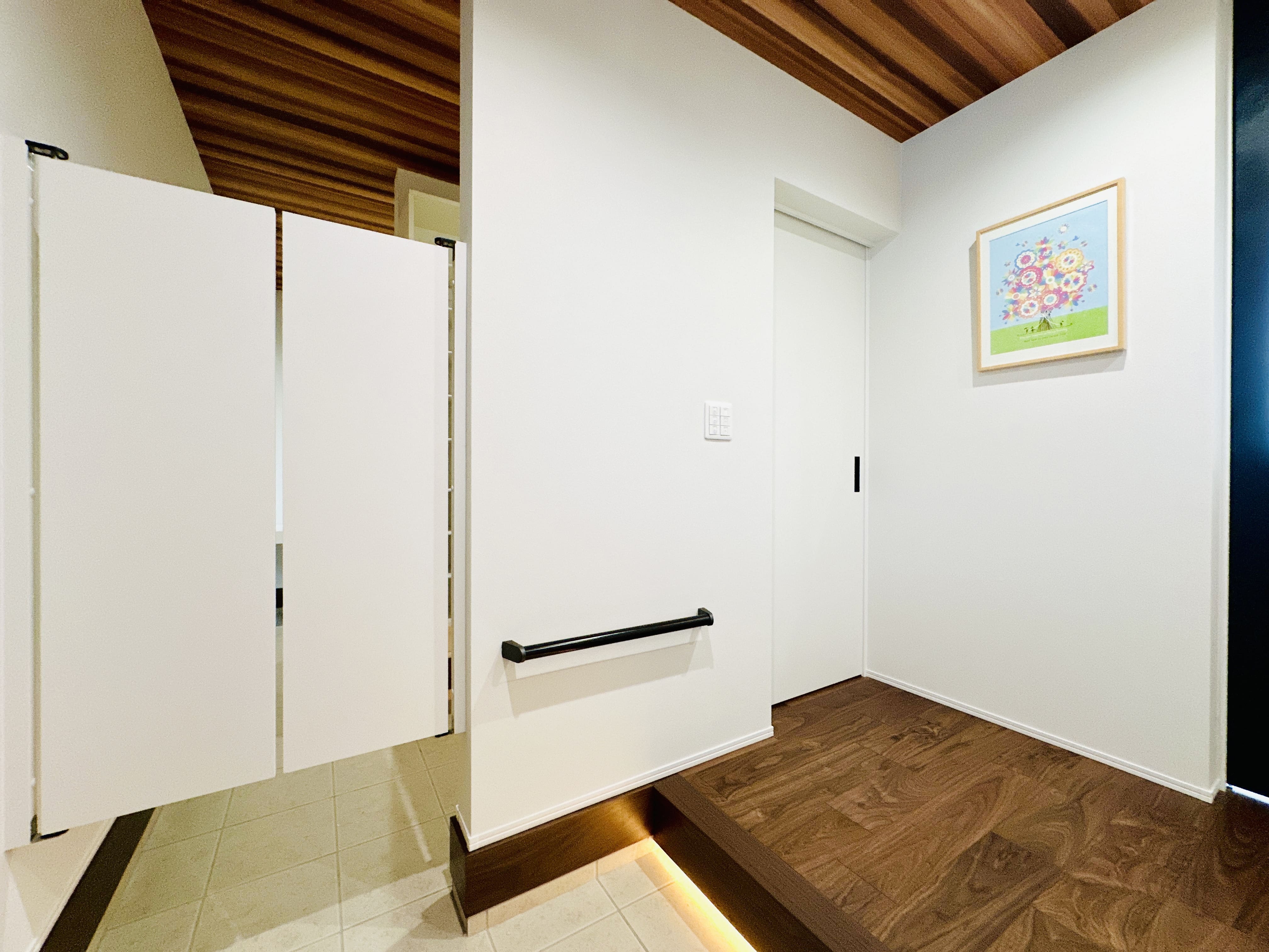 ベンチと手すりを設けた玄関ホールは、靴の脱ぎ履きがしやすく、日々の動作をさりげなくサポート。小さなお子さまからご年配の方まで、家族みんなが安心して使える配慮が行き届いた空間です。