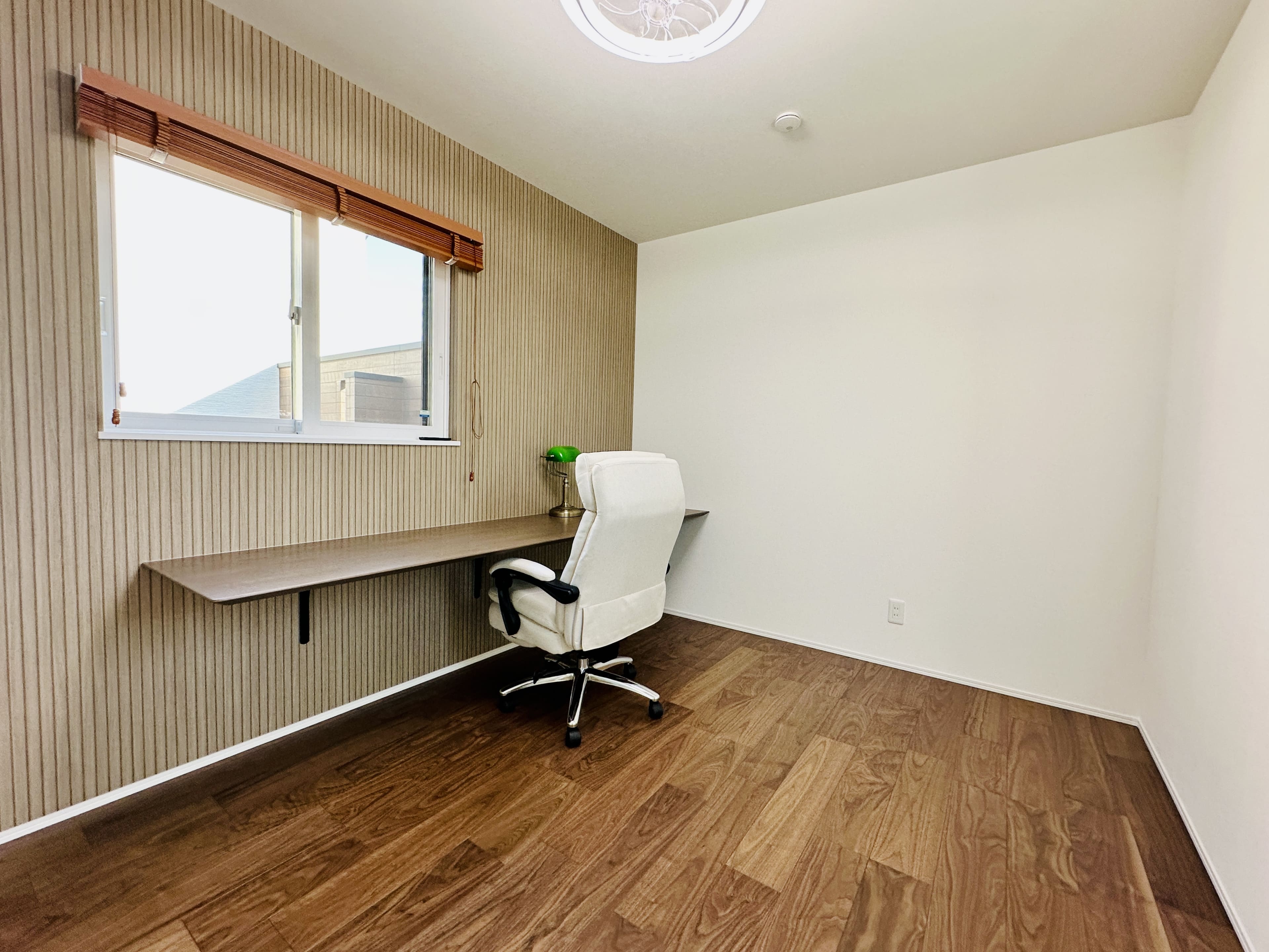 6.0帖のご主人の書斎スペースには造作のカウンターを設置。中庭に面した窓からやわらかな光を取り込み、仕事や趣味の時間を心地よく過ごせる、落ち着いた一室です。