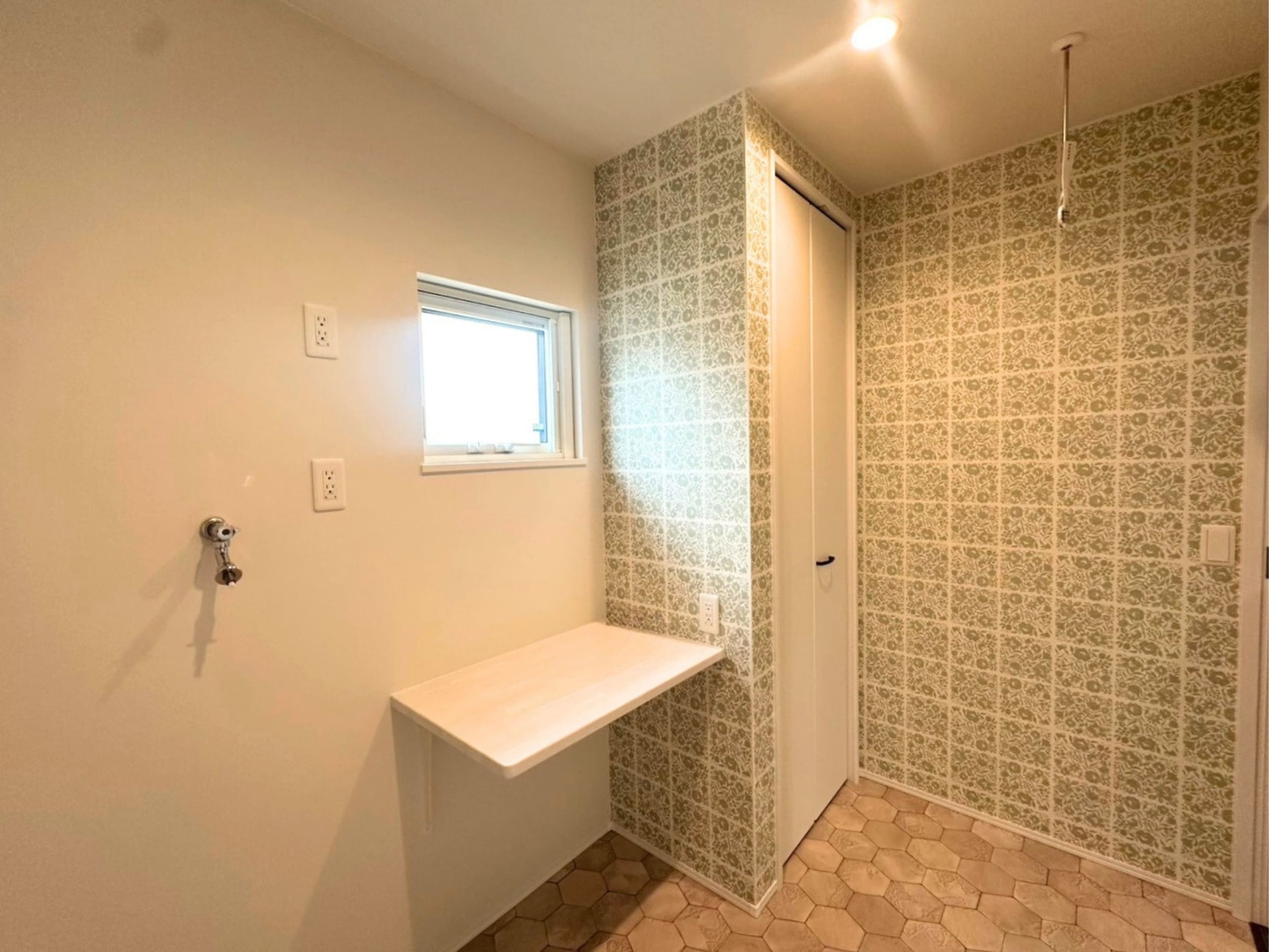 3帖のランドリールームは、イラストタッチの花柄アクセントクロスを採用。床にはアンティークレースや植物をモチーフにした型押しタイル柄を選び、家事空間でありながら、気分が上がるやさしい雰囲気に。