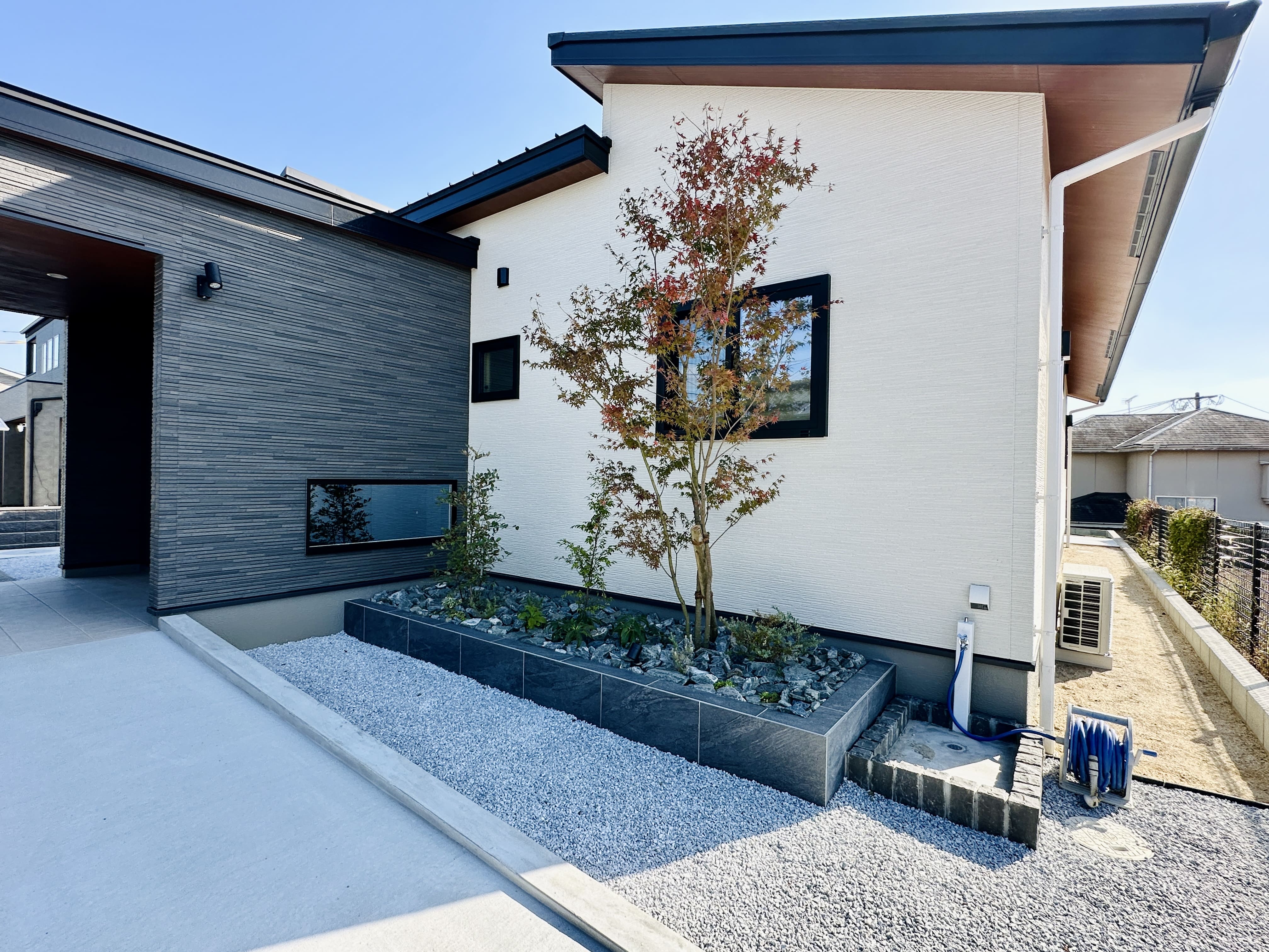 外観を引き立てる植栽は、和の趣を感じられる雰囲気に。時間とともに味わいが深まる、心地よい佇まいを作り出しています。