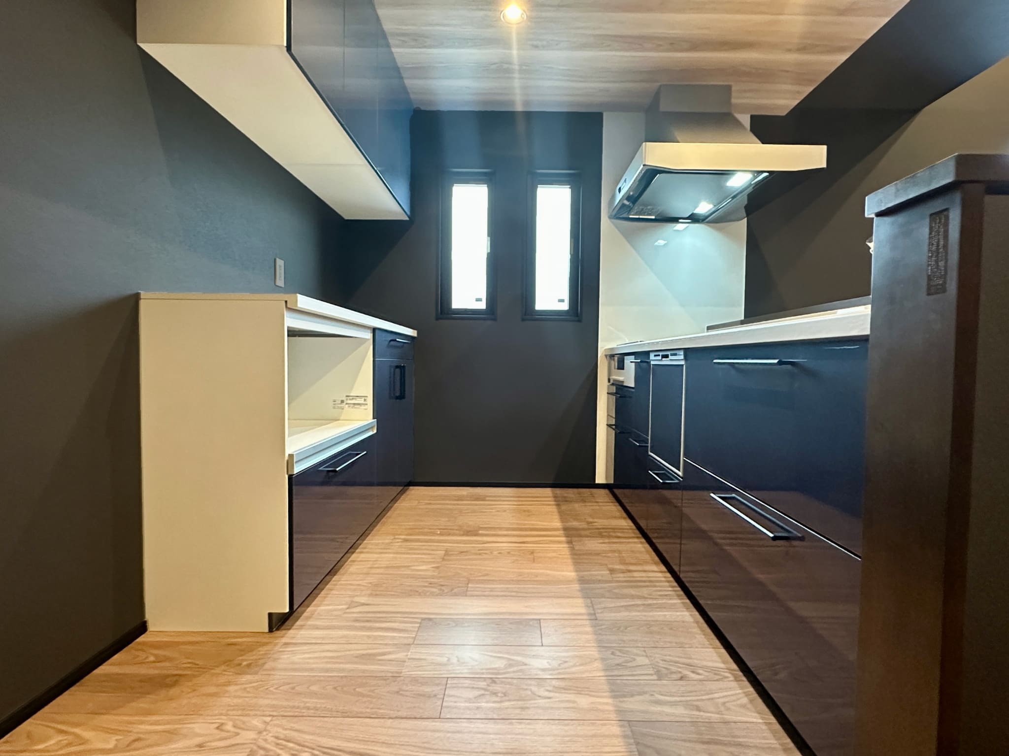 キッチンには縦長のスリット窓を採用。外からの視線を遮りながら自然光を取り込み、落ち着いた雰囲気の中にもほどよい明るさを感じられる空間になっています。