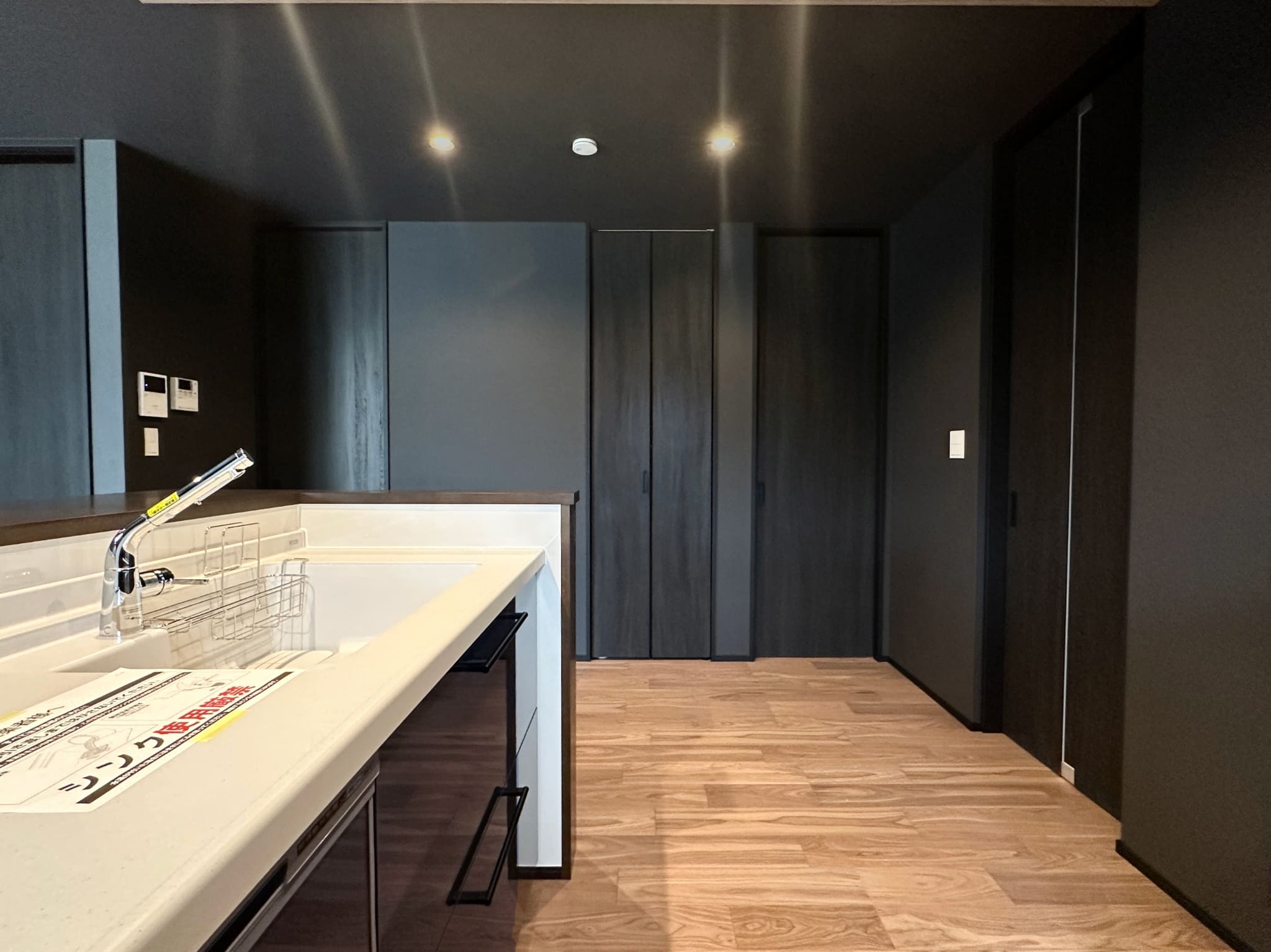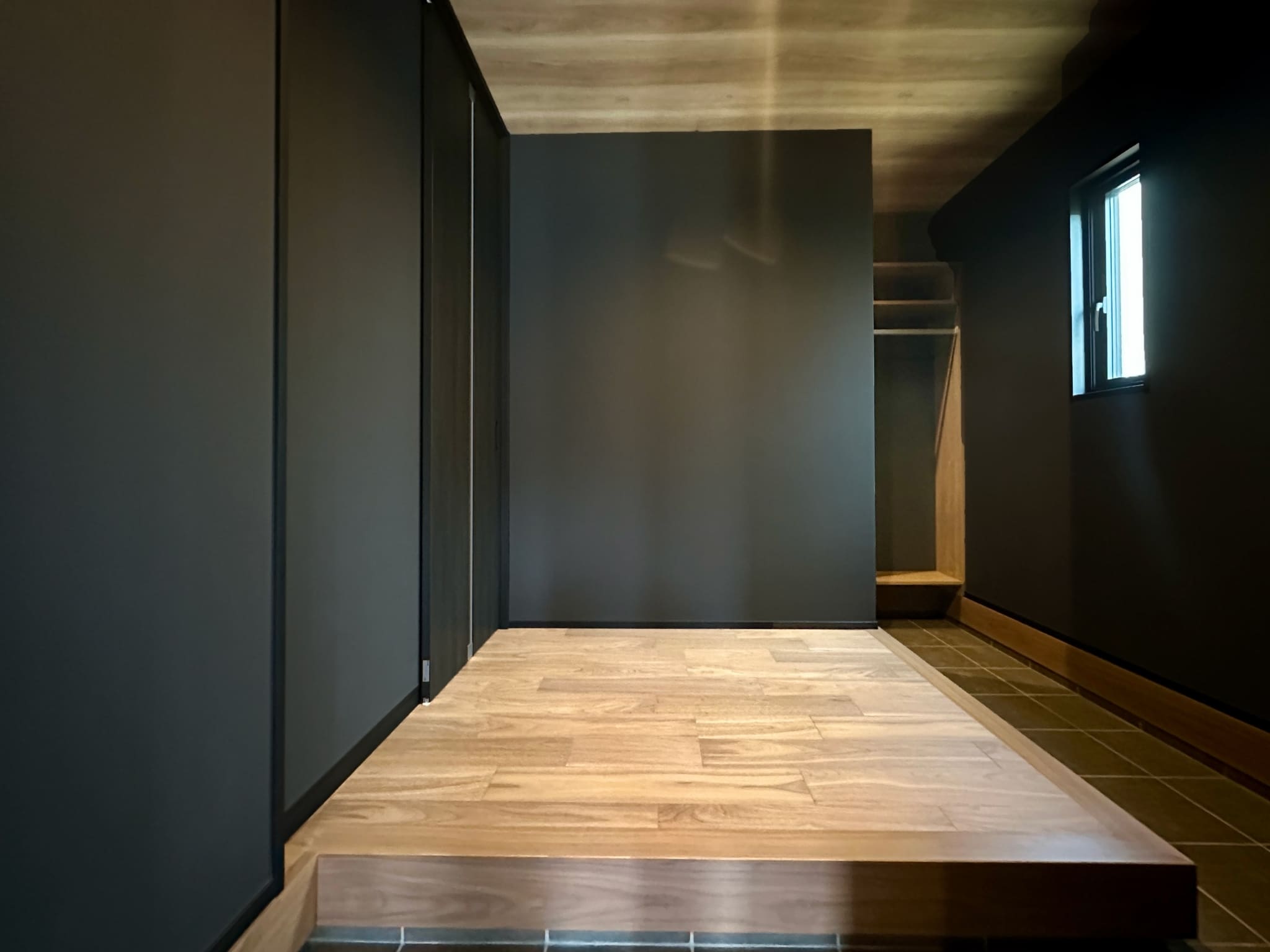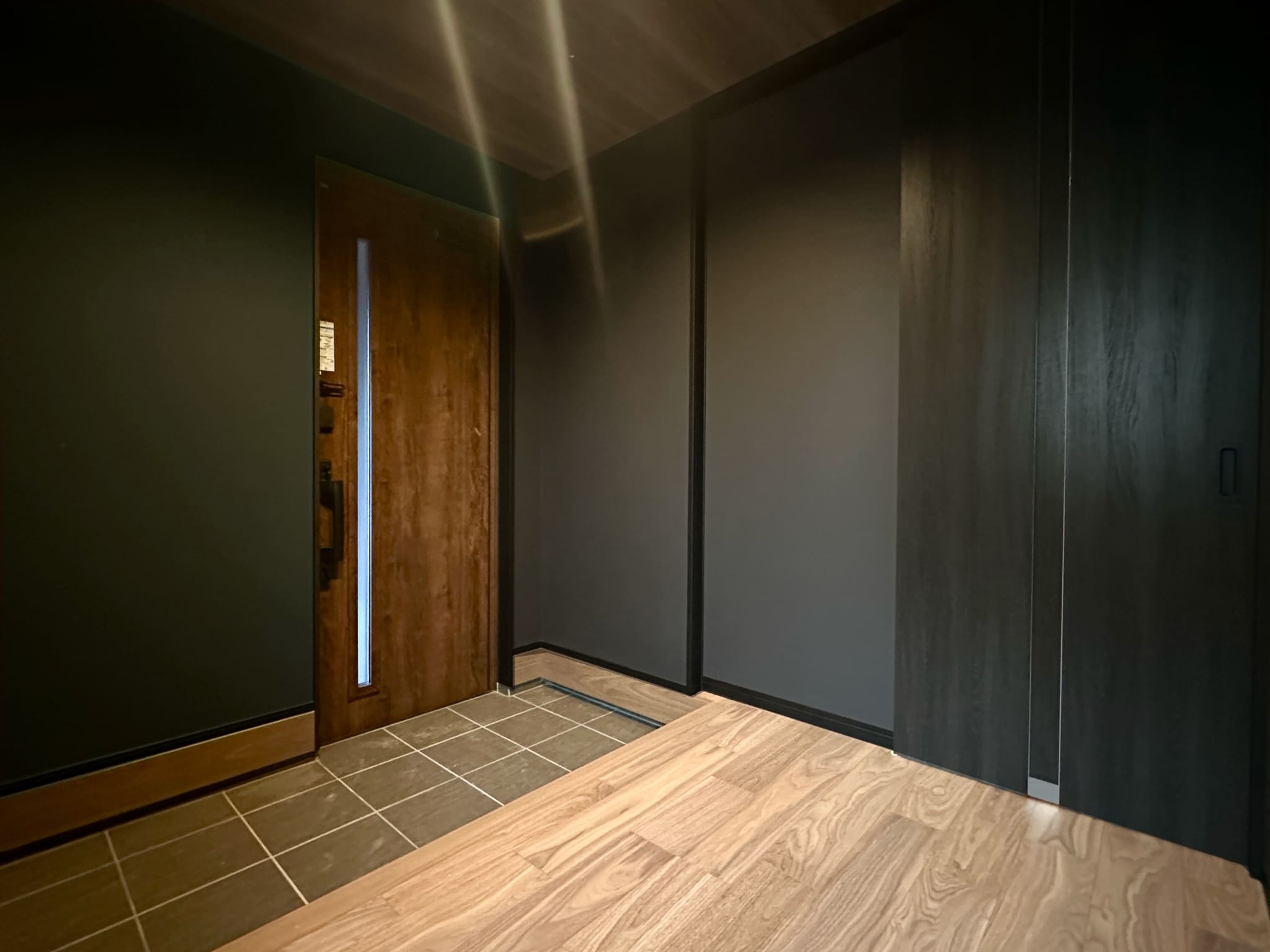 ブラックの壁紙が空間を引き締め、モダンで落ち着いた雰囲気を演出。木調のドアがアクセントとなり、上質な玄関空間に仕上がっています。