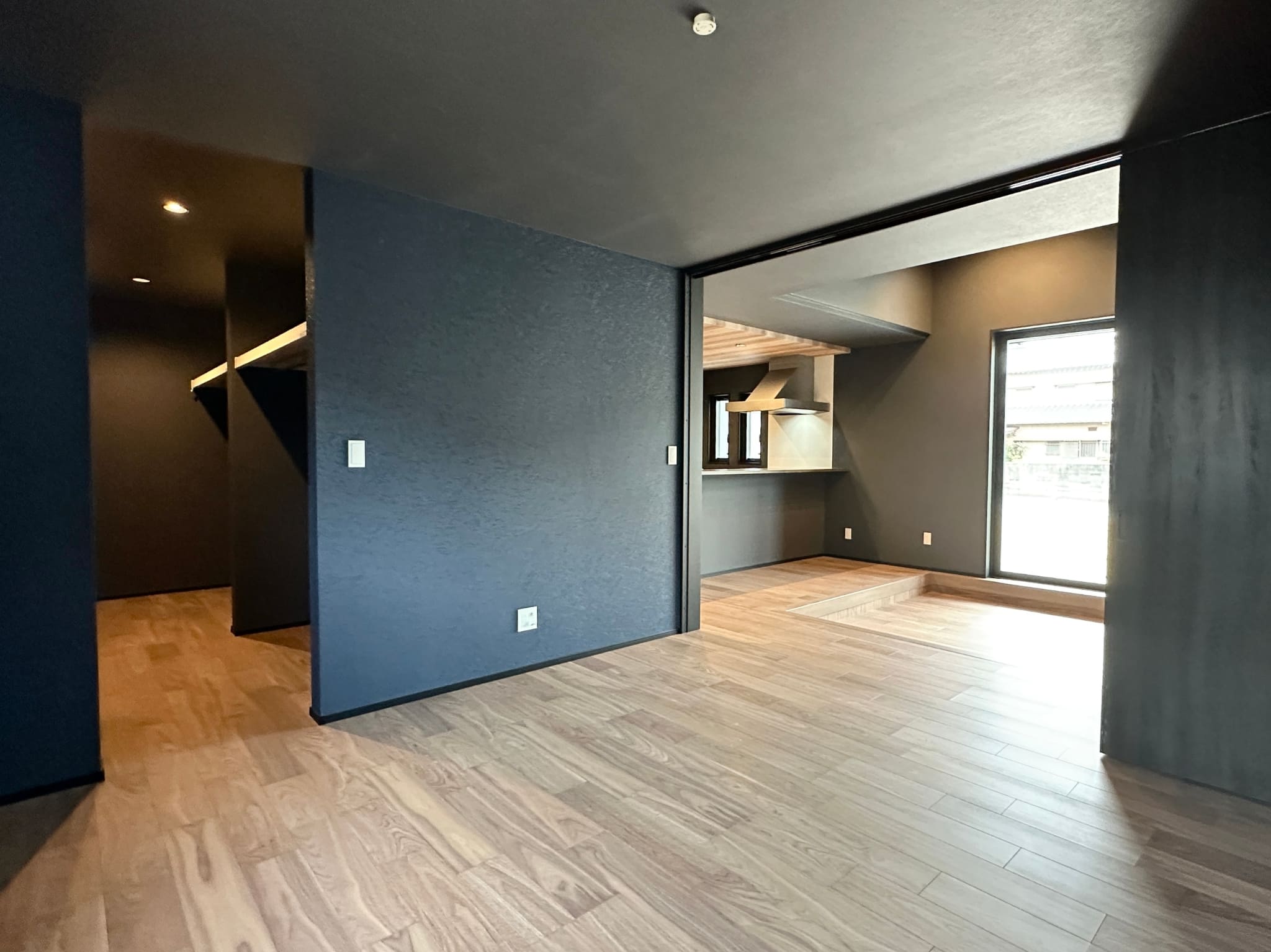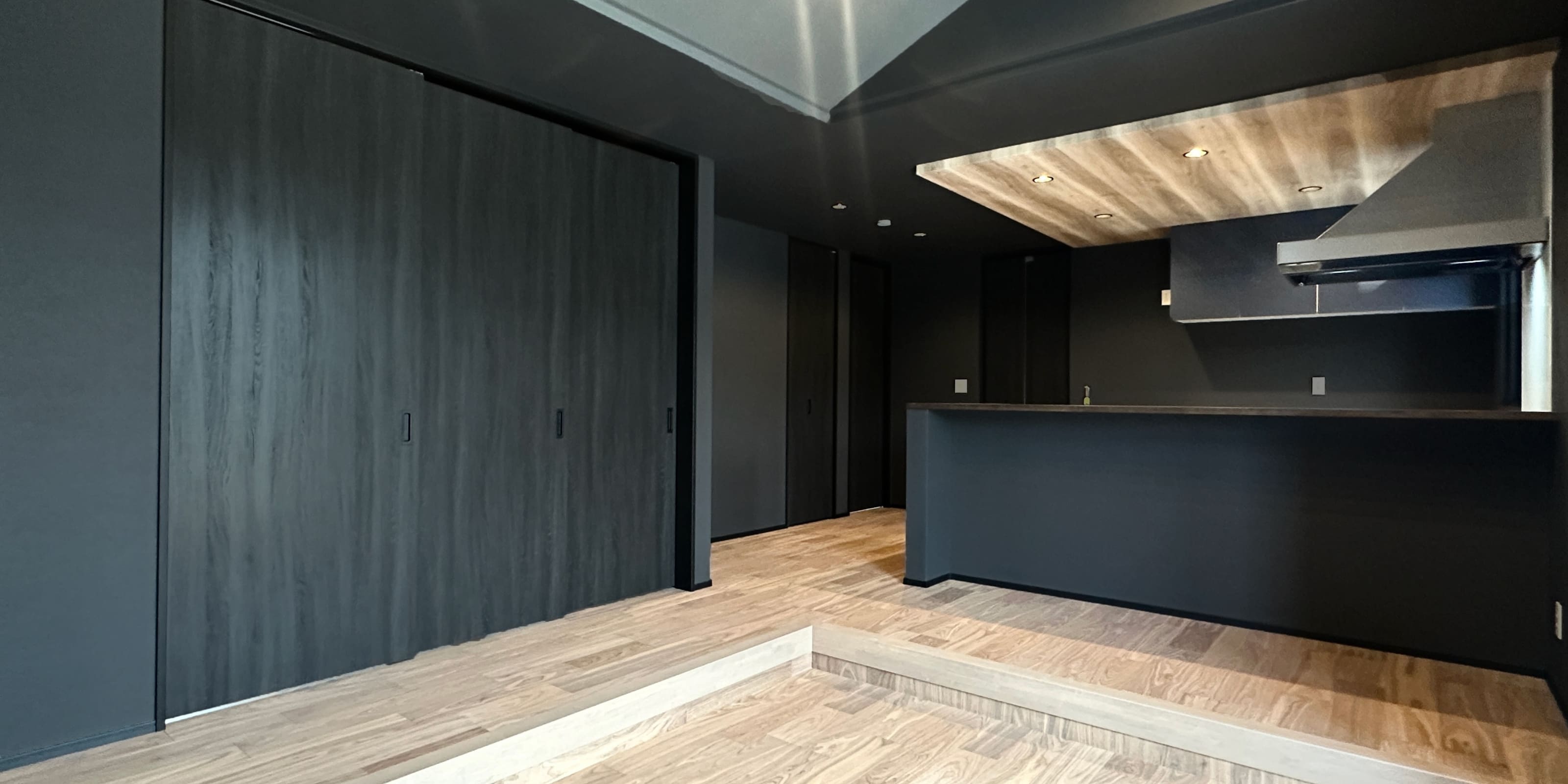 18帖のLDK。勾配天井の開放感とブラックのクロスが、シックな雰囲気を演出。ハイサッシから光が入り、昼と夜で表情の変化を楽しめる空間です。