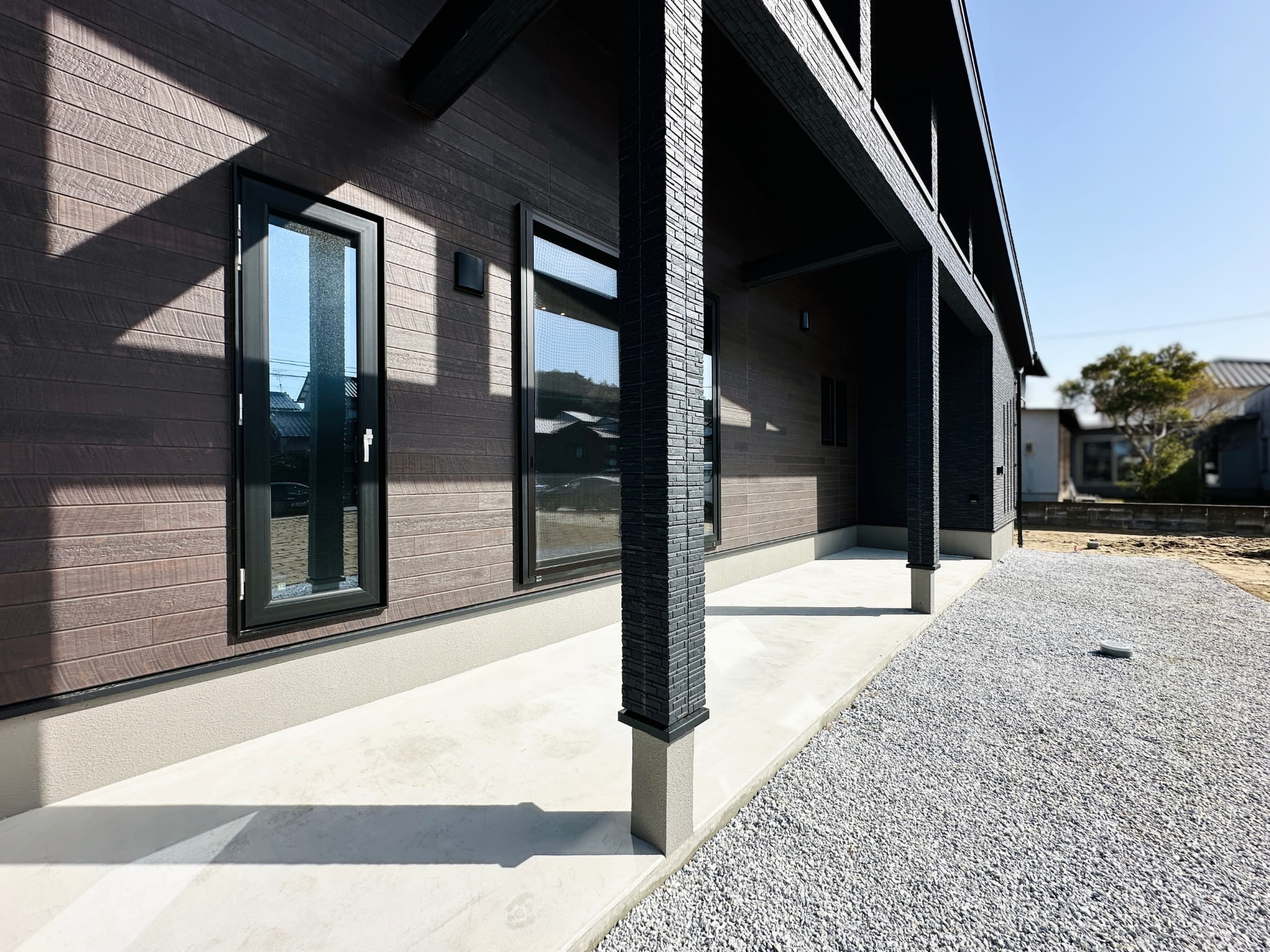 外壁に設けた縦のスリットが外観のアクセントに。玄関ポーチへやわらかな光を取り込み、明るさと開放感を生み出します。直線的なラインが、建物にシャープな印象を与えるデザインです。