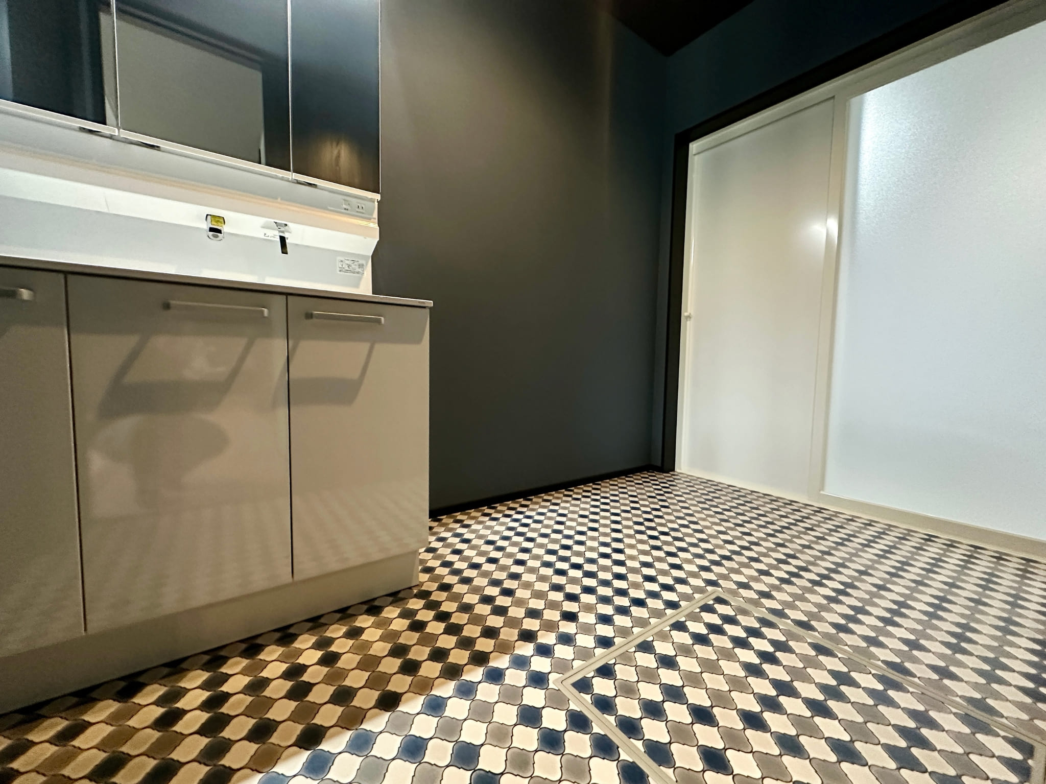 洗面脱衣室の床にはモロッカン柄のフロアを採用しました。幾何学模様のデザインが空間のアクセントとなり、印象的な洗面スペースに仕上がっています。