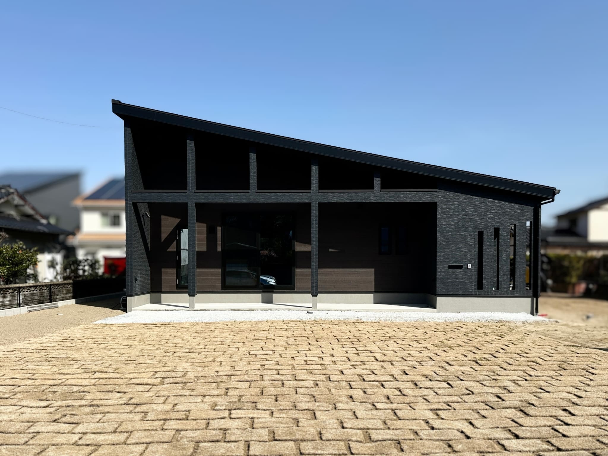 ダイナミックな片流れ屋根が印象的な外観。広い敷地を活かしたゆとりのある配置が、建物の立体感を際立たせ、建物の美しいシルエットを引き立てています。