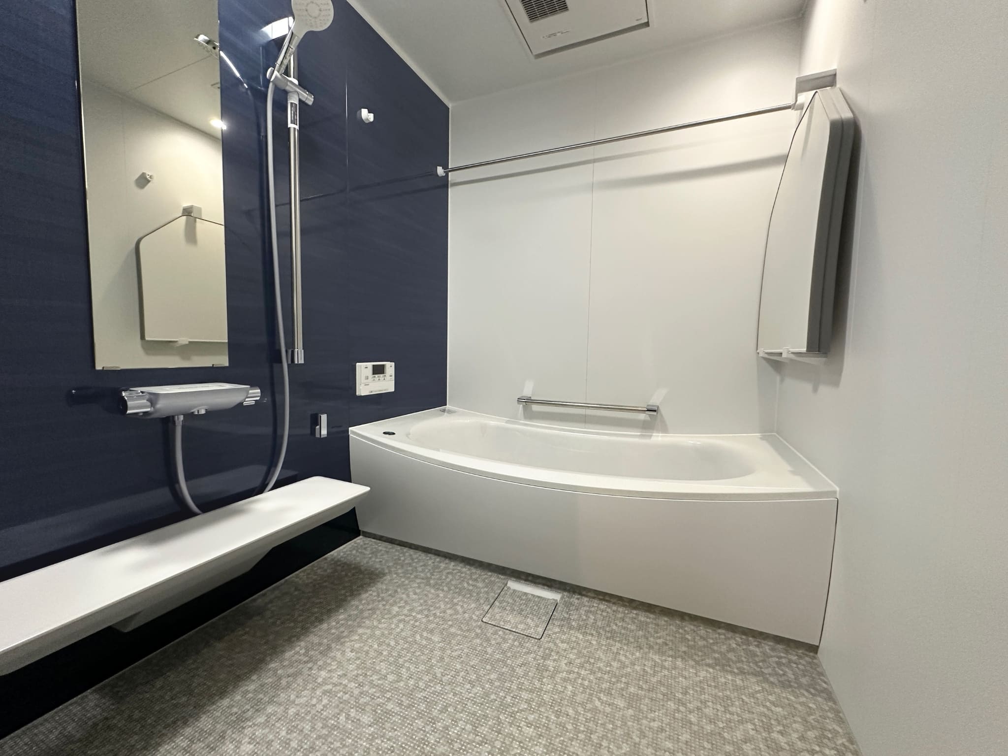 ダークブルーのアクセントパネルを取り入れ、空間にメリハリをプラス。落ち着きのあるクールな印象のバスルームに仕上がっています。